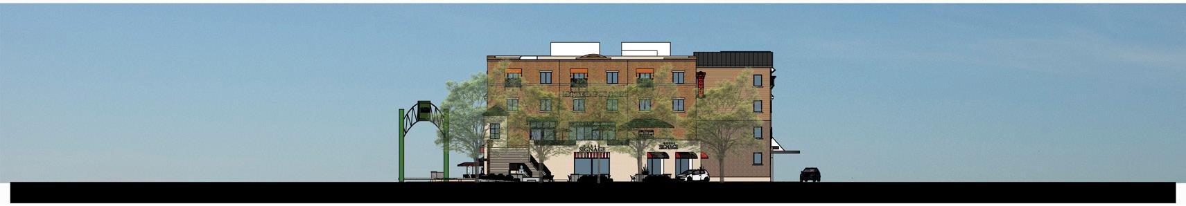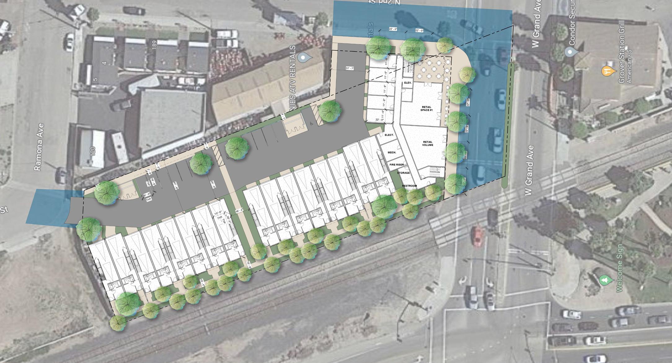 New construction of a proposed fourstory mixed-use podium building at 295 W Grand. The building will will have ground floor retail space, and 13 garage spaces with 60 1-2 bedroom residential units above. On site is 30 surface level parking spaces and 14 on street parking spaces.