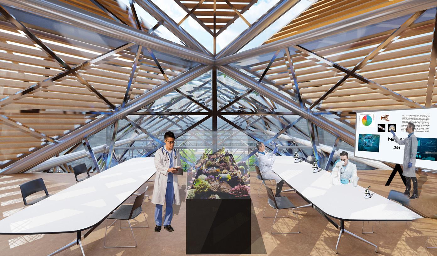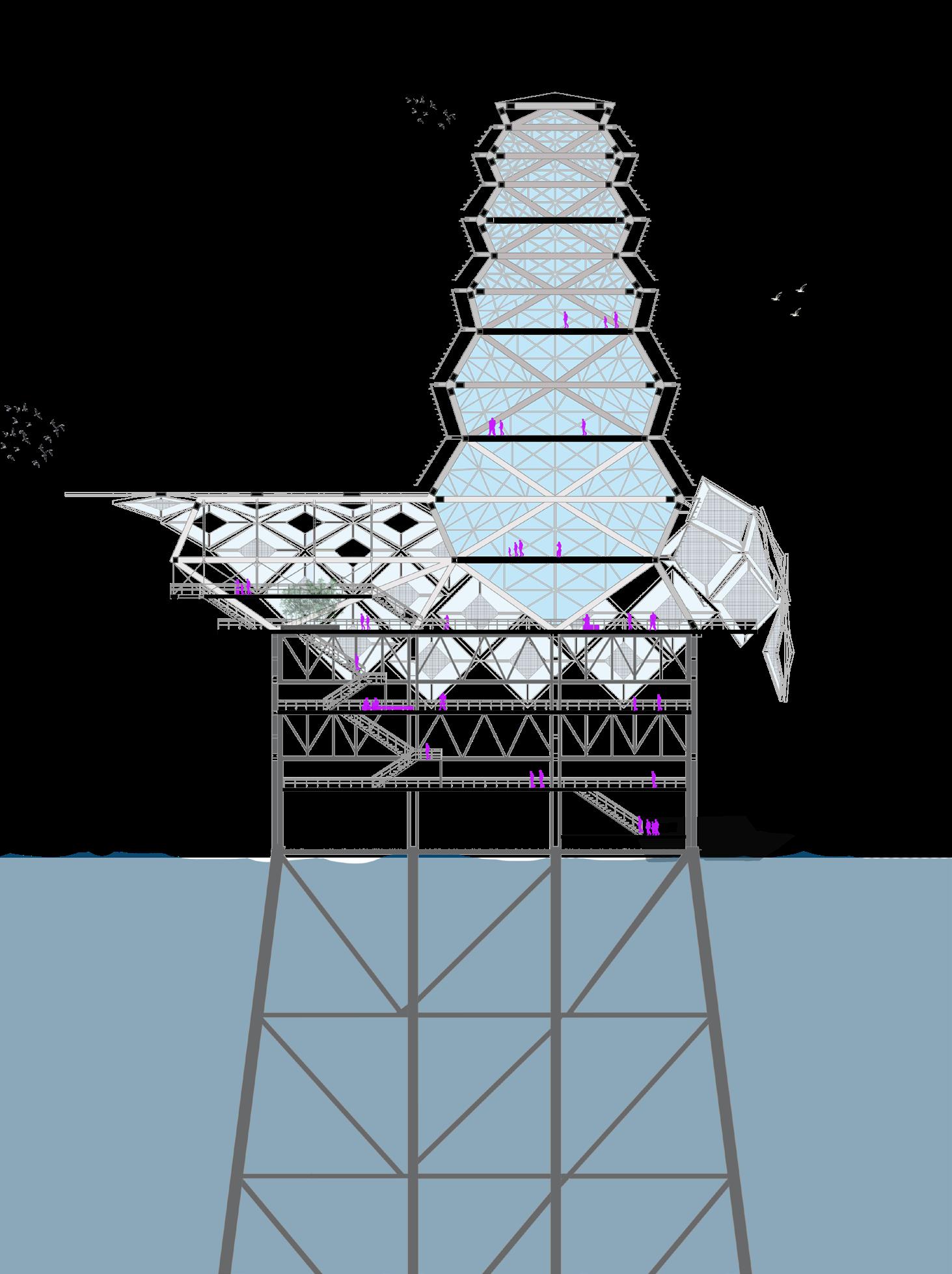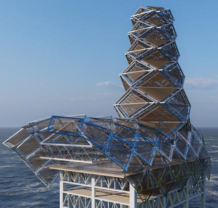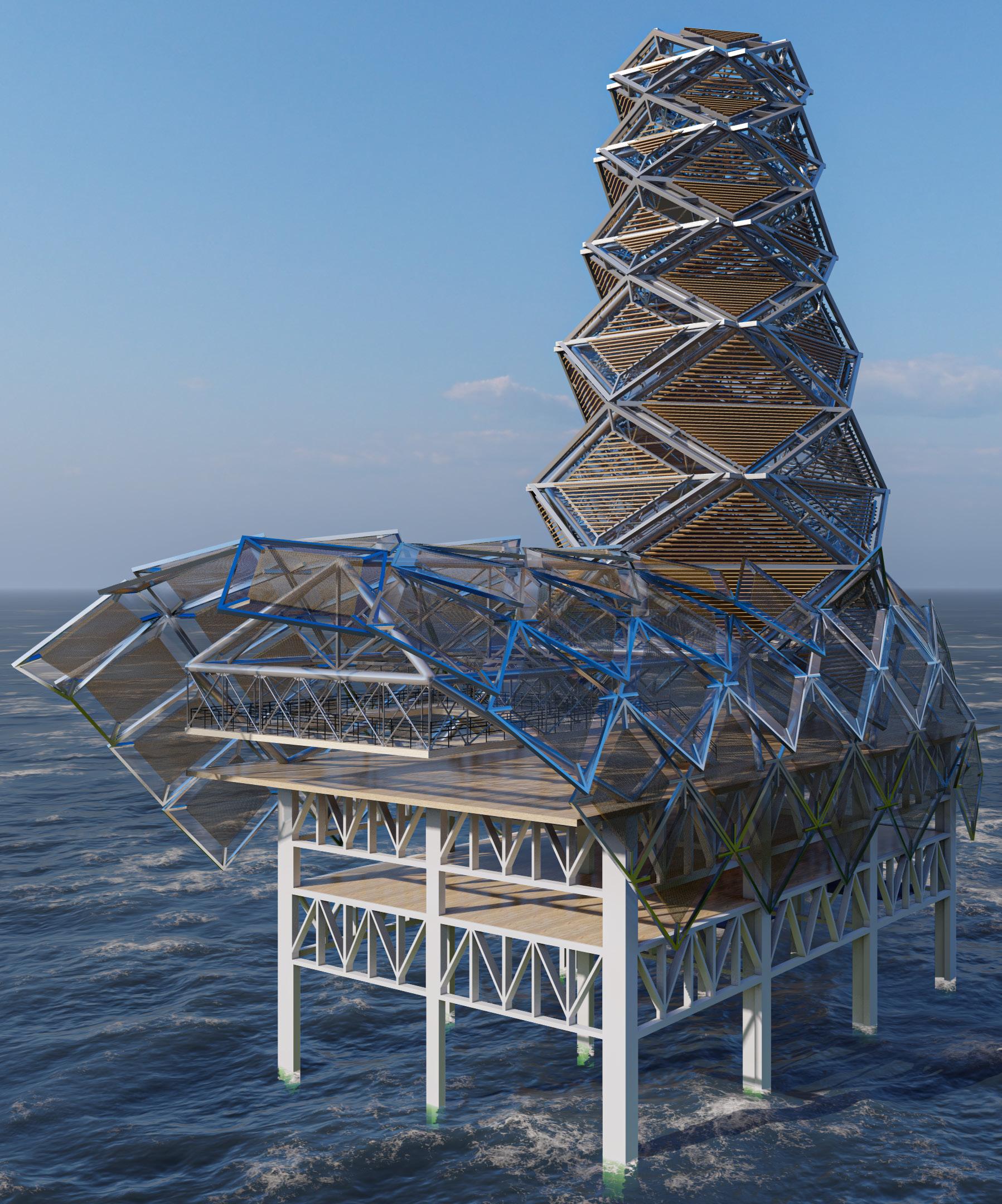Located on decommissioned Platform Holly, an oil Rig off the coast of Santa Barbara, California. Inspired by the formations of seashells and barnacles’ natural growth, Platform X is a proposed biological marine research center for the adaptive reuse project. The immersive research center offers wet and dry laboratories, micro-living units for the researchers, a large atrium/ gallery space for visitors to admire, and much more.