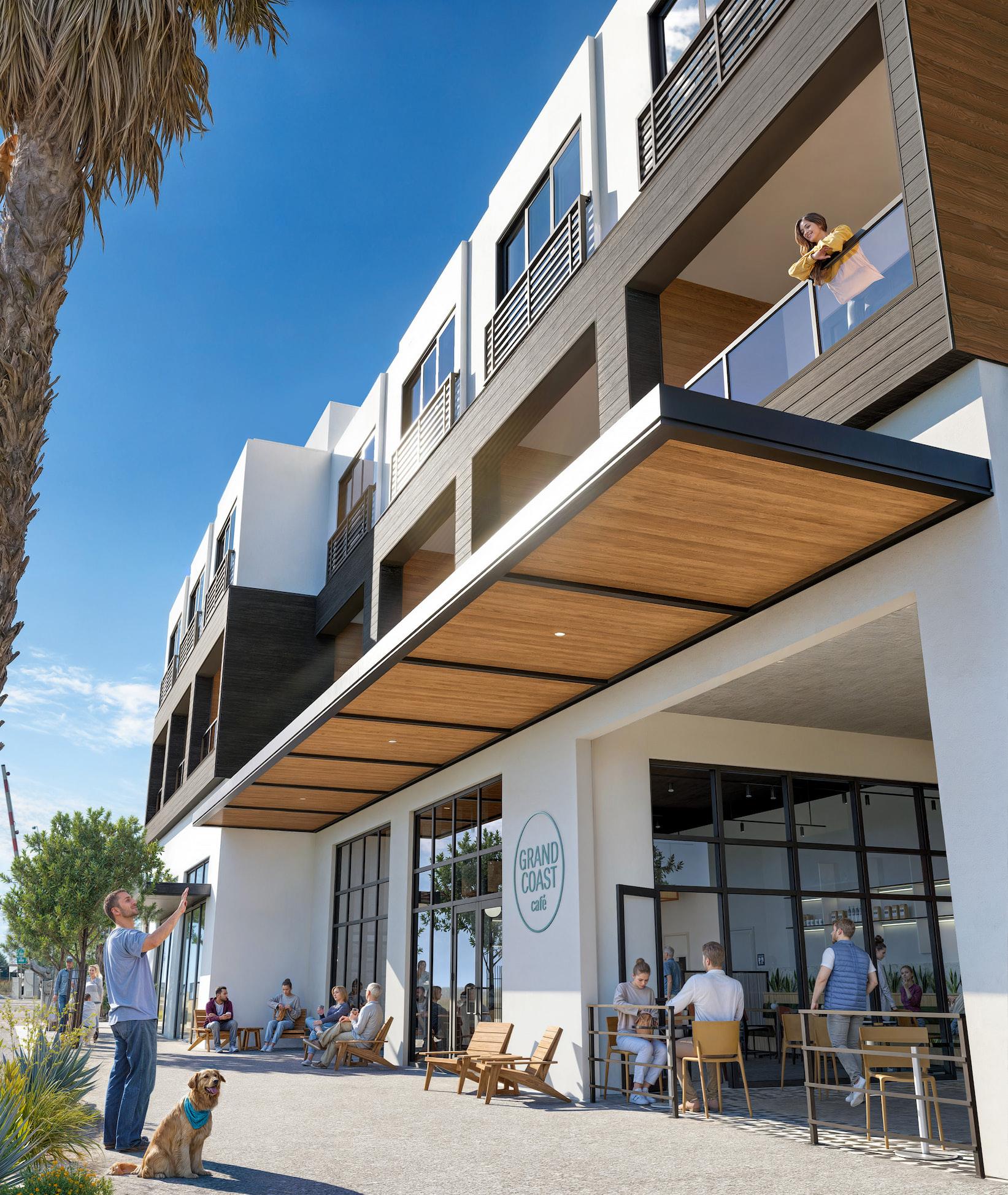 New construction of a proposed four-story mixed-use building at 197 Grand Ave. in Grover Beach, CA. The ground floor contains 2,077 SF of commercial/restaurant space, along W Grand Ave., as well residential units only on the non grand frontage. There are 57 total parking spaces provided, 11 of which are on the street. 23 3-Bedroom units.