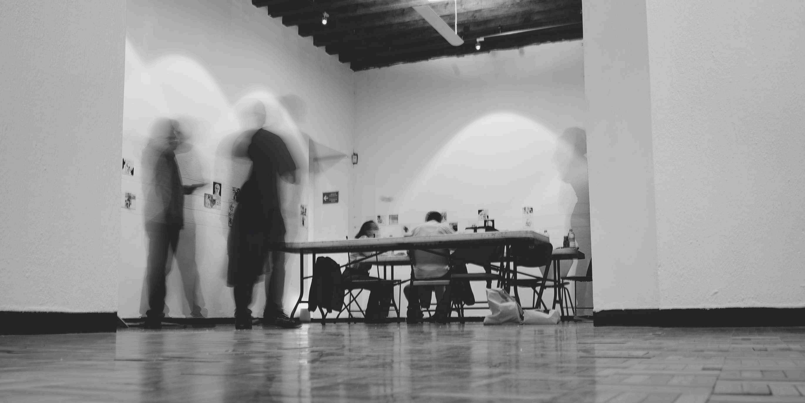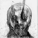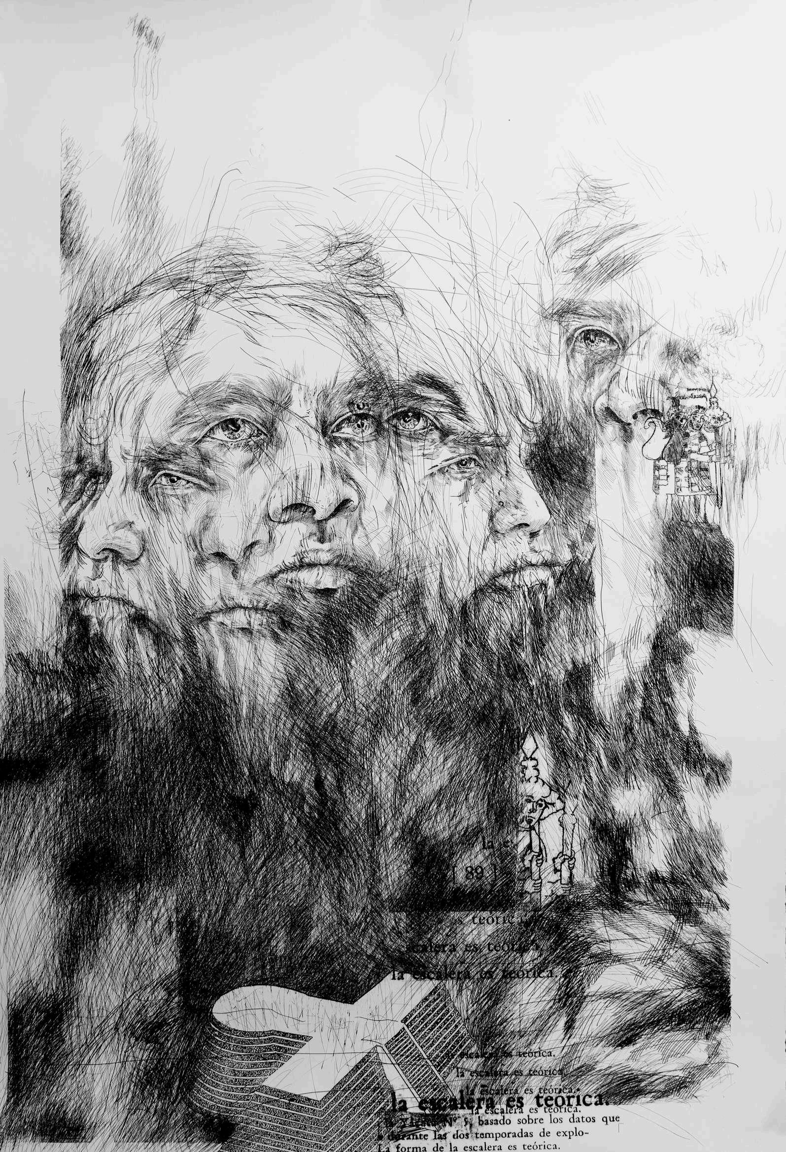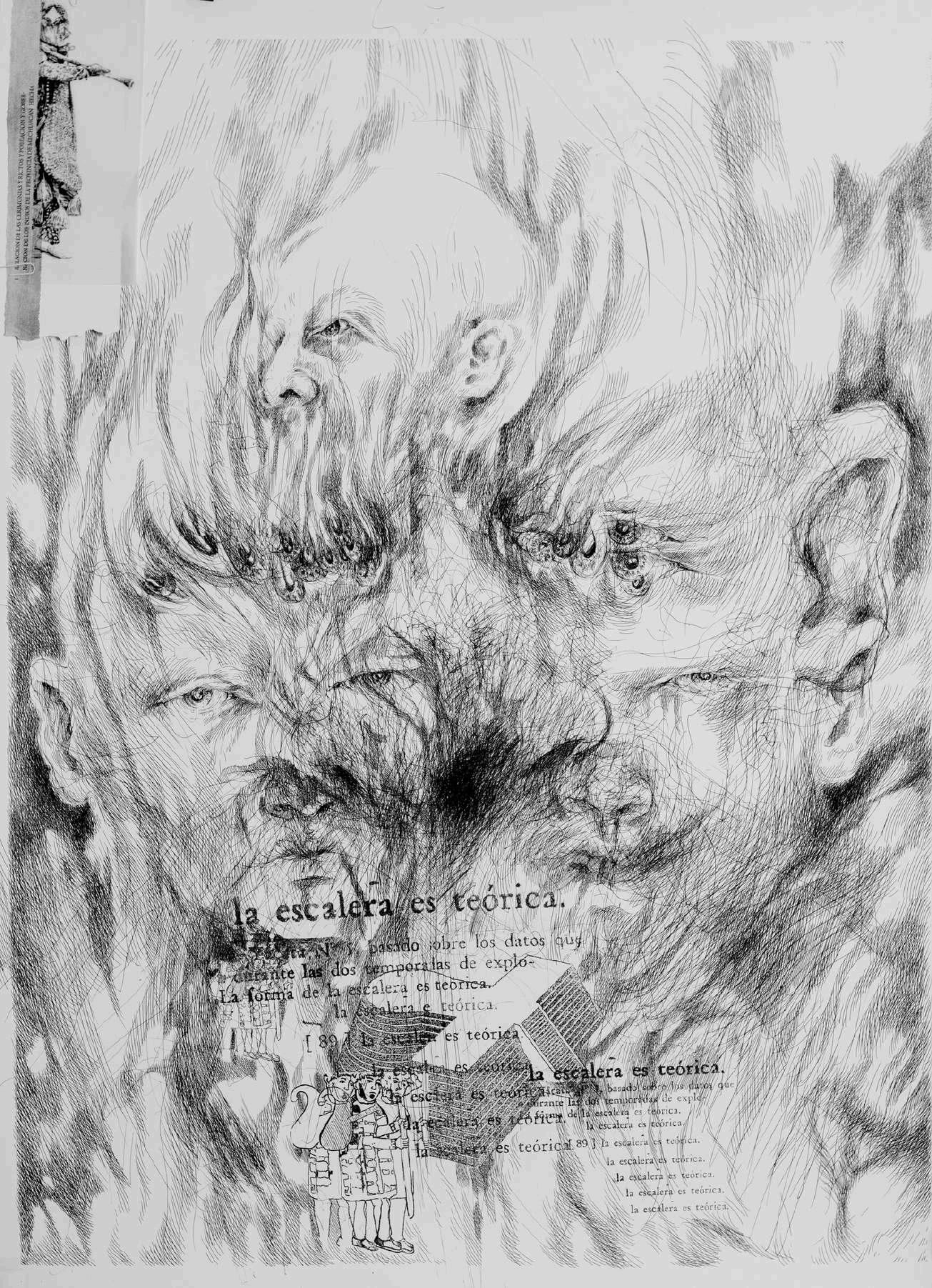 Hay una incógnita que rodea los dibujos de Pablo Querea; la oscuridad casi completa de algunos de ellos evoca la búsqueda de los orígenes, se borran las facciones, se difuminan las líneas que revelan los rostros. Hay una indagación constante que se muestra a través de la tinta, del papel; las caras que el autor ha creado se encierran en la sombra de la tinta, aparecen tímidamente, se vuelven seres descarnados, gestos, sonrisas, muecas; quizá la piel que no aparece es justo la identidad que se busca y esta búsqueda se percibe a través de la saturación del negro, en el juego de éste con el blanco, con el papel y con sus fibras, con el trazo; se hace evidente en las transiciones que esas caras se van sucediendo a través de espacios y en diferentes tiempos.