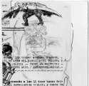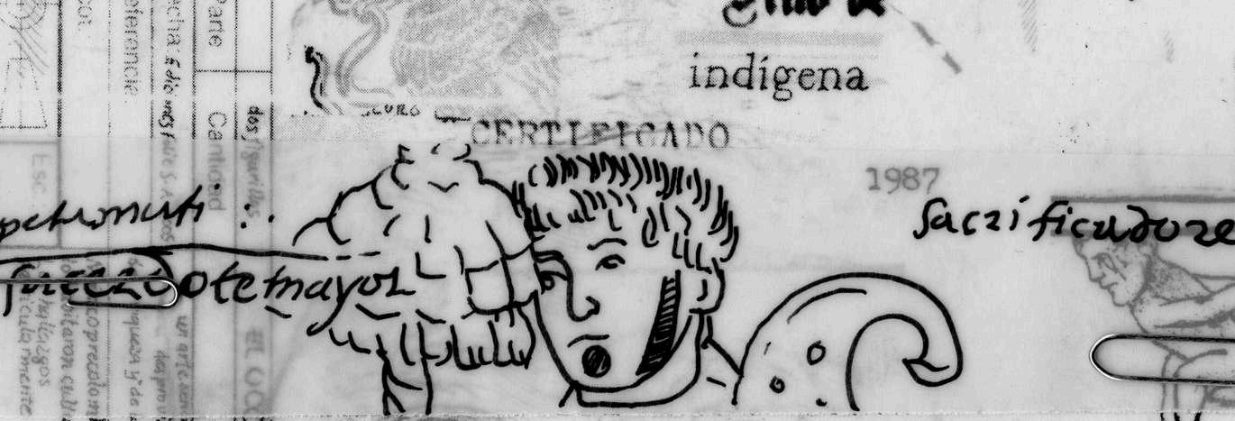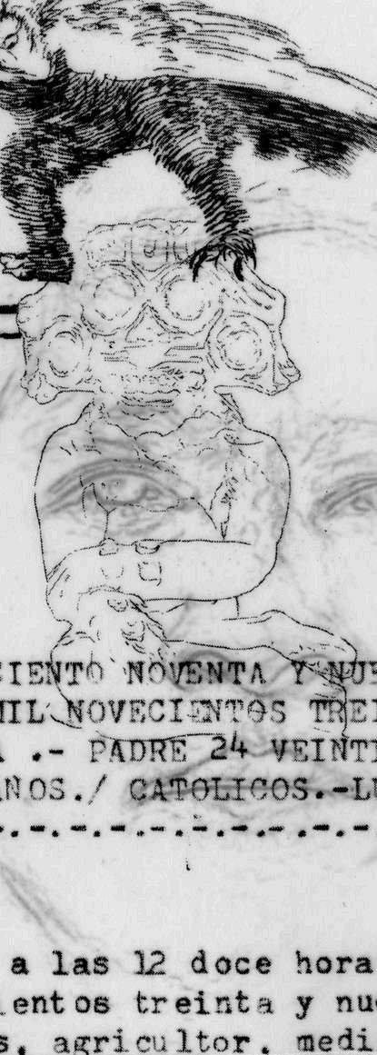 En la extrema derecha, al centro, se puede leer la oración "no te entiendo, porque ya no hablamos, ya no hablamos, no hablamos, hablamos", expresando la confusión que me causaba la información encontrada y los múltiples cuestionamientos que surgían al observar los documentos y los personajes a los que hace referencia este dibujo.