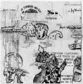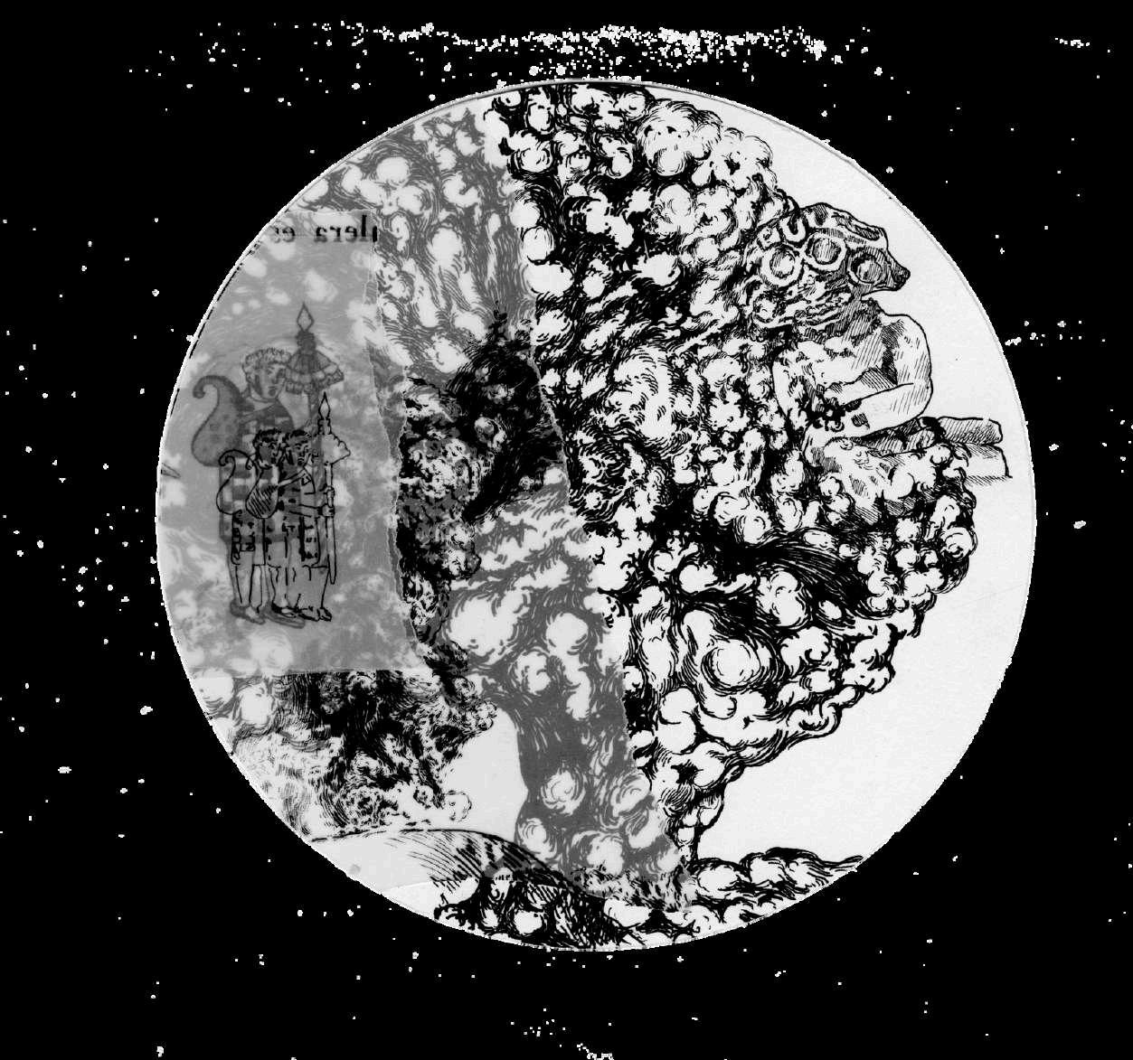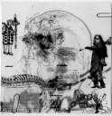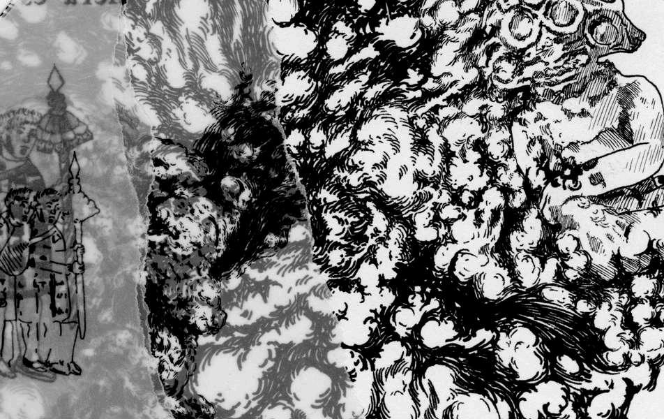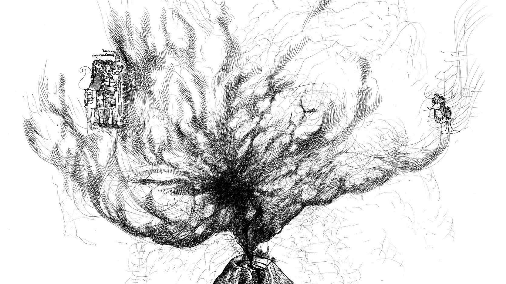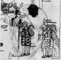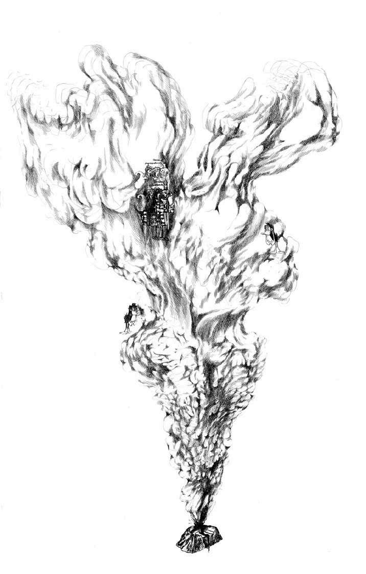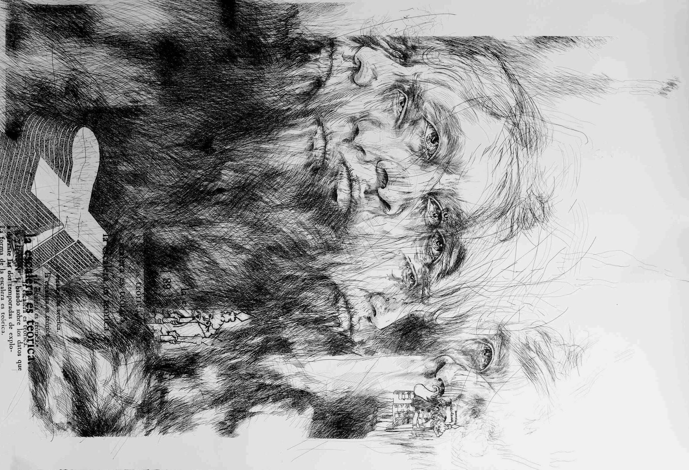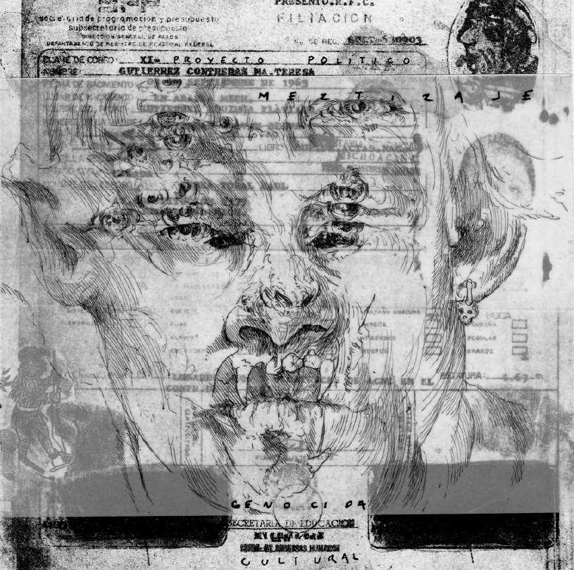 Si bien esta no es la primera imagen que hice sobre este tema, sí es la que contiene los elementos más relevantes que surgieron de la reflexión en torno a este personaje. Es un dibujo en tinta china sobre papel de algodón y Albanene o papel mantequilla superpuesto sobre el papel de algodón.