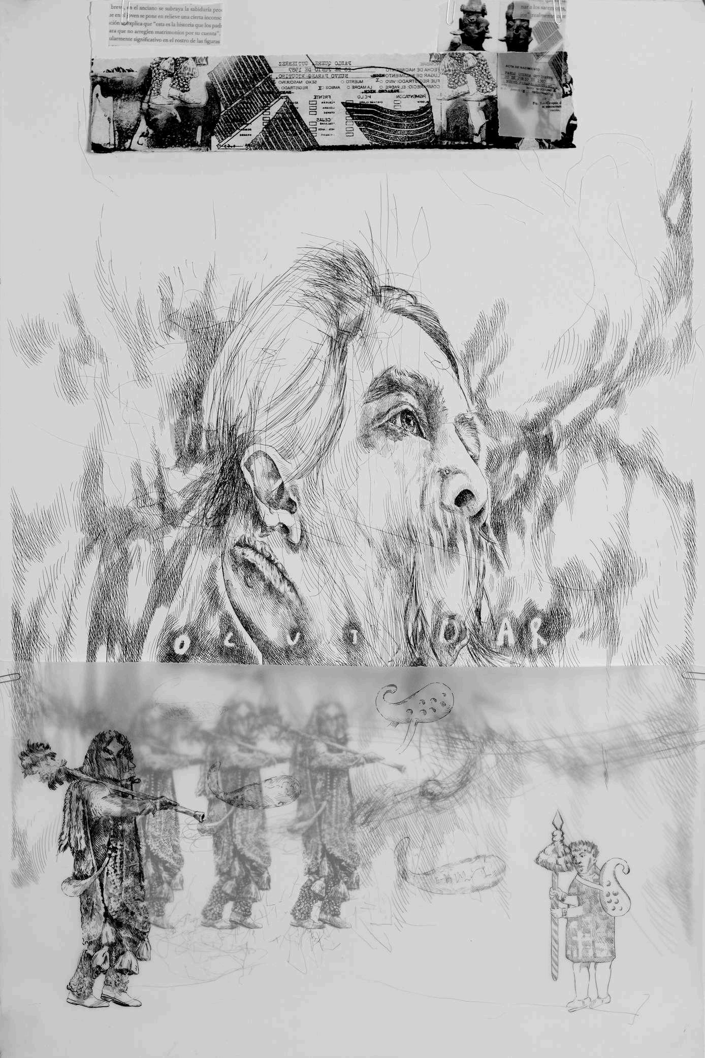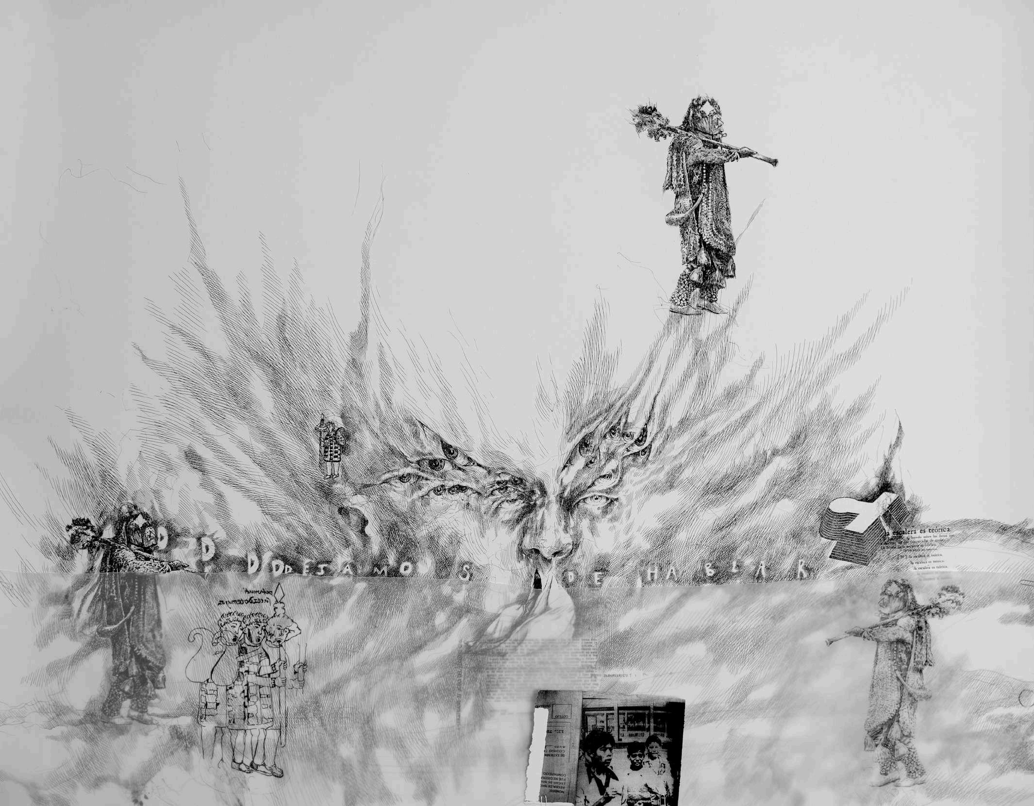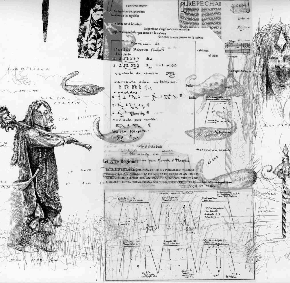 En la parte superior izquierda, hay una fotografía de T’arepiti de algún periódico de los años ochenta. Finalmente, en la parte superior derecha, de manera superpuesta está colocada una fotocopia sobre albanene con la palabra purépecha de un periódico que hablaba de la música tradicional michoacana y que tenía una partitura musical, intentando señalar que lo que vemos en el dibujo tiene sonido.