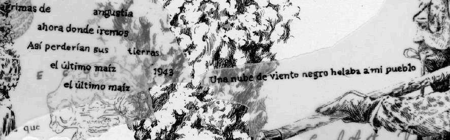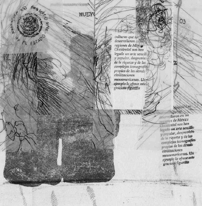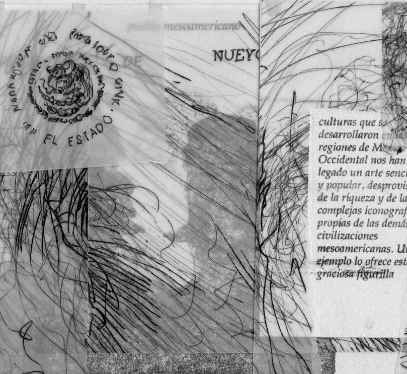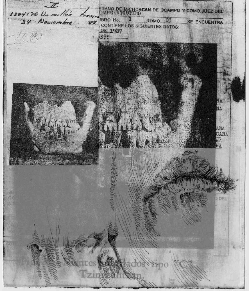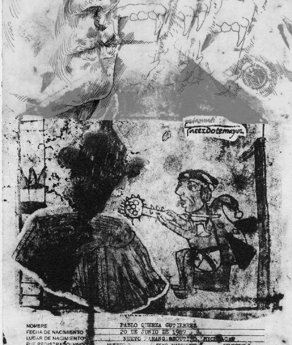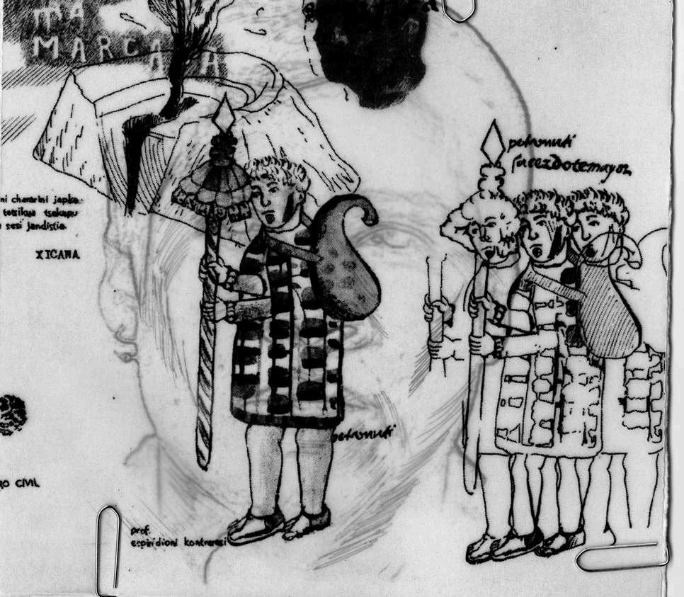 En la parte superior izquierda, hay una fotografía de T’arepiti de algún periódico de los años ochenta. Finalmente, en la parte superior derecha, de manera superpuesta está colocada una fotocopia sobre albanene con la palabra purépecha de un periódico que hablaba de la música tradicional michoacana y que tenía una partitura musical, intentando señalar que lo que vemos en el dibujo tiene sonido.