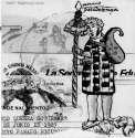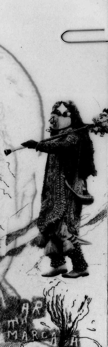 Sobre él se puede ver una partitura, insistiendo en que el dibujo tiene sonido, y a la izquierda, al fondo, una fotografía de kurpite con la frase "del arte regional" al frente.