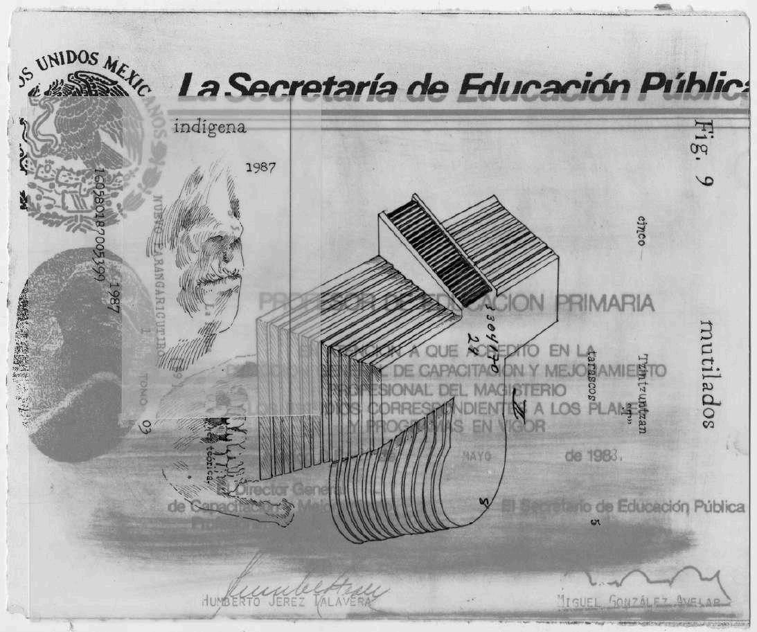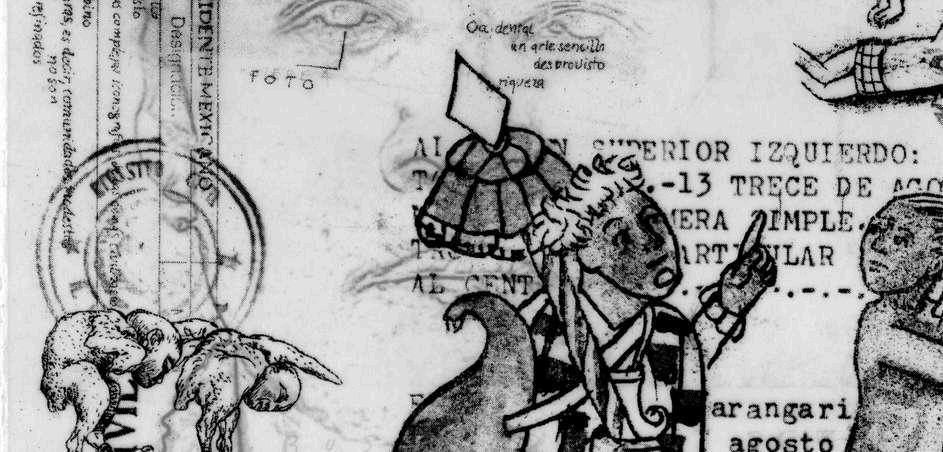 En la parte inferior derecha se puede observar la estructura espacial que debe recorrer el personaje mencionado en la danza de los kurpites. Arriba de ello, podemos ver y leer un fragmento en fotocopia sobre albanene del título completo del documento conocido como la Relación de Michoacán, y arriba otra fotocopia superpuesta que dice "Arte regional", intentando volver a conectar estas reflexiones con la idea de desprecio e insignificancia que le da la tradición occidental a las representaciones culturales indígenas al colocarlas en el lugar de "arte menor".
