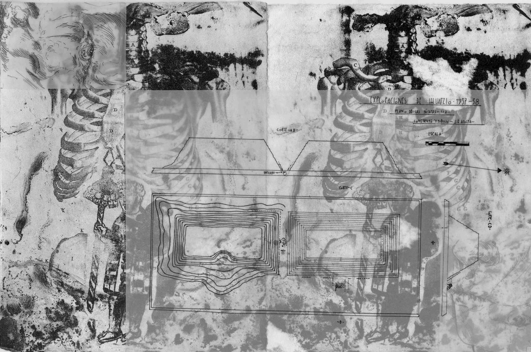 Recordé el centralismo como una razón por la cual la cultura de mi región desaparece, al menos eso pensaba en ese momento. Sin embargo, encontré un documento sobre la primera exploración de Tzintzuntzan, que resultó ser muy útil para enriquecer visualmente lo que estaba intentando comunicar o encontrar. La información en dicho documento me proporcionó herramientas simbólicas relacionadas con lo que estaba experimentando. Por ejemplo, incluía un dibujo que representaba una Yácata de Tzintzuntzan y en esta representación se destacan dos aspectos que me parecieron significativos; El primero era que esta edificación, en el transcurso del tiempo posterior al abandono del asentamiento y como resultado de la búsqueda de tesoros, había perdido 4 metros de volumen, R Acosta (1938, p. 89). Esto fue impactante porque verla en ruinas ya me parecía un vestigio bello e impactante. Pero además, saber que lo que yo veía era simplemente una etapa constructiva y que el monumento había sido mucho más grande de lo que yo podía percibir, eso a mí me indicaba que la pérdida física era enorme, evidentemente, pero también era una representación simbólica de la pérdida intangible que yo sentía sobre esta cultura
