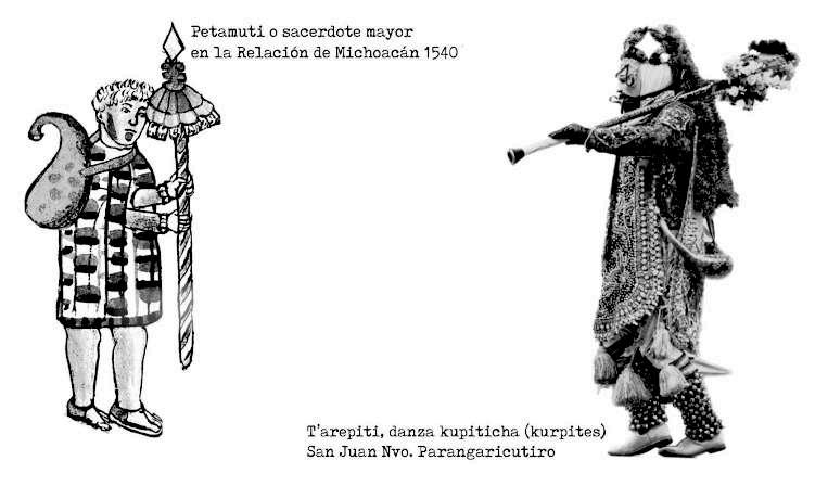 En la imagen a la izquierda, podemos ver la figura del Tárepiti, personaje principal de la danza de los kurpites. Su nombre significa "el más viejo", y al mismo tiempo los sacerdotes antes y después de la conquista han sido llamados “Cura”, que significa abuelo. En la palabra encuentro una pista de su posible vínculo. Frente a él, coloqué varios guajes que son mencionados entre las insignias de sacerdote a las que antes hice mención.