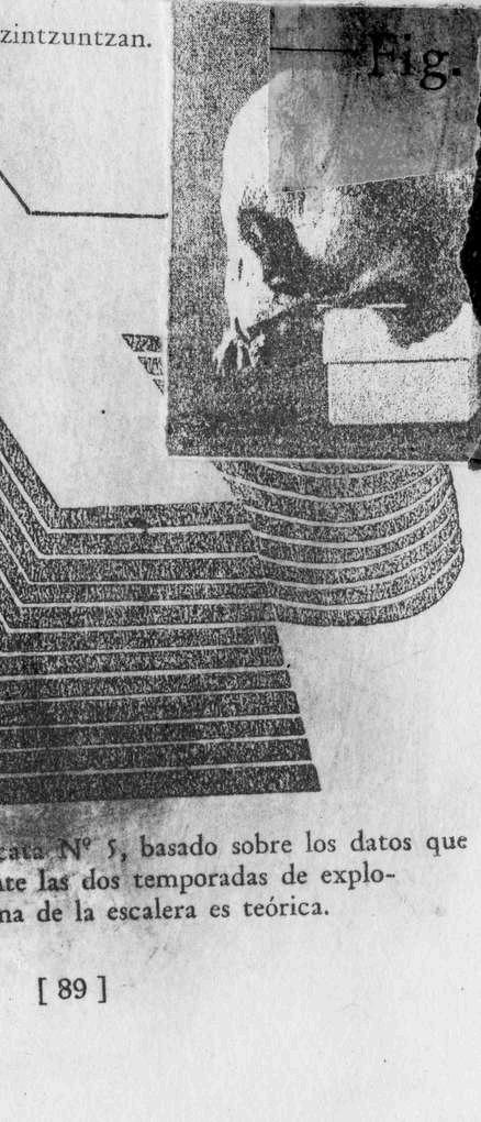El segundo está relacionado con la representación de una escalera que el monumento actualmente no tiene. Los arqueólogos encontraron uno o dos escalones y supusieron que había una escalinata hasta la cima. En el pie de foto de la imagen (imagen 10), podemos leer que la forma de la escalera es teórica, al igual que todas las suposiciones que yo podía tener sobre la cultura purépecha, R Acosta (1938, p. 90). Esto representaba el distanciamiento que yo sentía hacia la cultura purépecha, incluso representaba el despojo que yo sentía como indígena forzado a ser mestizo. Esa escalera para llegar a la cima ya no está, ya no existe, ya no tenía yo por donde subir para encontrarme con mis ancestros. Eso era lo que yo creía. Sin embargo, seguí insistiendo en comprender esa cultura y me acerqué de nuevo a mi familia para contarles lo que yo había descubierto. Al hacerlo, y con el ejercicio de búsqueda de documentos, fui descubriendo o, mejor dicho, observando acciones festivas y cotidianas que estaban en palabras en los documentos antiguos que yo analizaba.