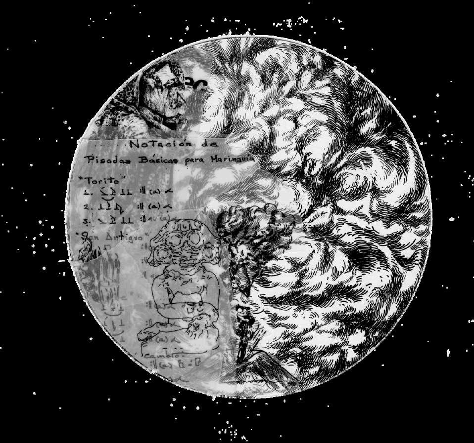 La construcción de esta imagen se generó a partir del entendimiento de la danza y sus elementos, y la comparación con la descripción del sacerdote mayor en la relación de Michoacán. Para entender los elementos de la danza, utilicé el texto "Kurpiticha" de la Maestra Rocío Próspero, que me ayudó a comprender el origen de la danza a través de la tradición oral que ella recopiló. Además, ella construyó un registro de la partitura del zapateado, así como la traza de los danzantes en el entarimado donde bailan.