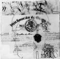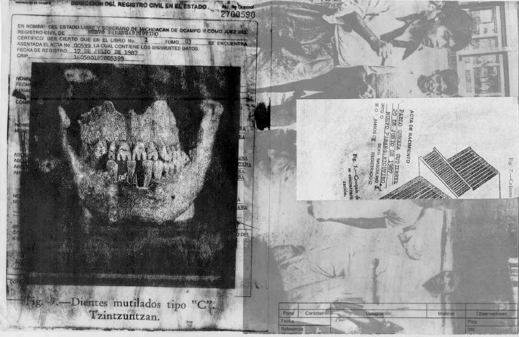 En el extremo izquierdo, se pueden ver otro conjunto de fotocopias sobre papel mantequilla. Como elemento principal, podemos observar una fotocopia de la página encontrada en la transcripción del documento de la Relación de Michoacán, publicada por el COLMICH, en dicho fragmento se mencionan las insignias de sacerdote, tratando de darle sustento a todo lo escrito en puño y letra en el dibujo.