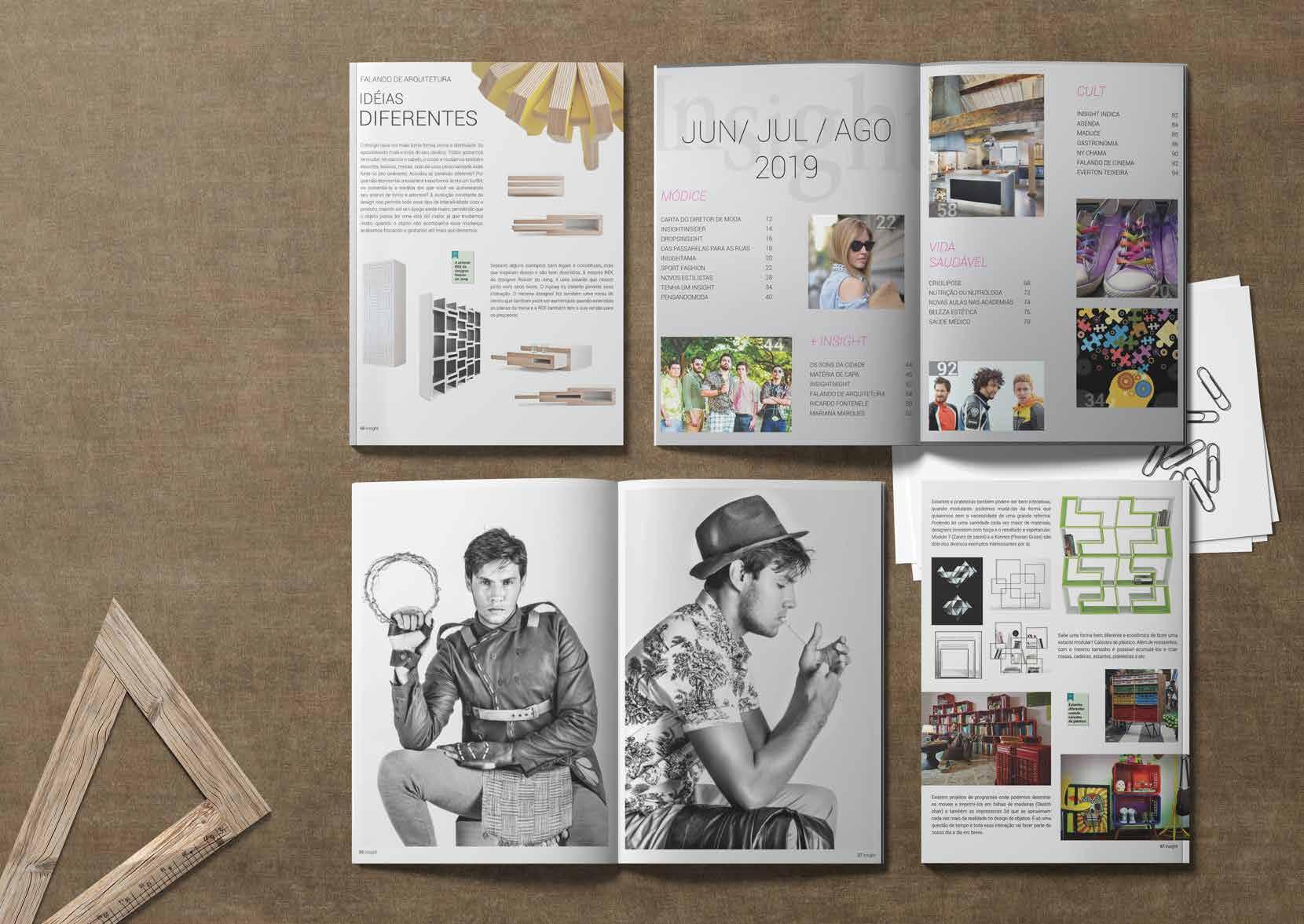 A Revista Insight foi um projeto de informações culturais bimestral, no qual a ideia era colocar em um caldeirão de páginas as mais variadas formas de entretenimento. O briefing do projeto gráfico e a diagramação não poderiam ser diferentes. Com abordagens modernas e limpas, o desafio foi passear por todas as páginas criando um ambiente comunicativo que estabelecesse a relação leitura e conforto visual, não deixando a ousadia de lado.