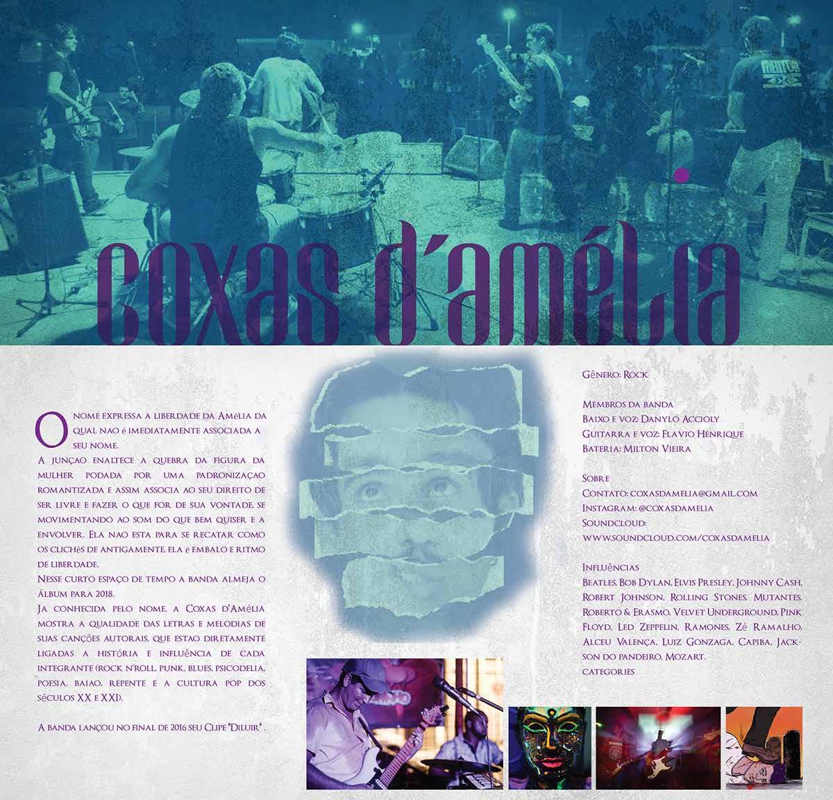 A banda Coxas d’Amélia é conhecida em Recife pela qualidade das letras e melodias de suas canções autorais, que estão diretamente ligadas à história e influência de cada integrante. A peça solicitada é parte da principal divulgação da banda nos meios culturais e artísticos.