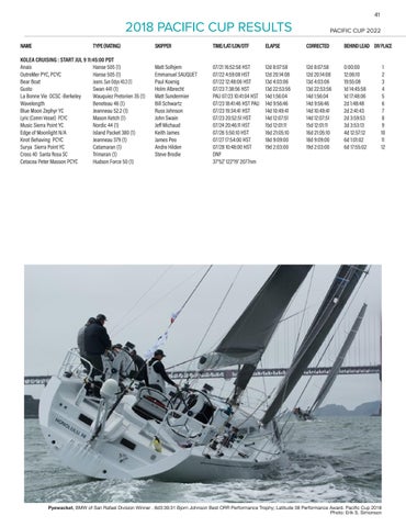 KOLEA CRUISING : START JUL 9 11:45:00 PDT Anais Hanse 505 (1) Matt Solhjem OutreMer PYC, PCYC Hanse 505 (1) Emmanuel SAUQUET Bear Boat Jeann. Sun Odys 40.3 (1) Paul Koenig Gusto Swan 441 (1) Holm Albrecht La Bonne Vie OCSC -Berkeley Wauquiez Pretorien 35 (1) Matt Sundermier Wavelength Beneteau 46 (1) Bill Schwartz Blue Moon Zephyr YC Jeanneau 52.2 (1) Russ Johnson Lyric (Comm Vessel) PCYC Mason Ketch (1) John Swain Music Sierra Point YC Nordic 44 (1) Jeff Michaud Edge of Moonlight N/A Island Packet 380 (1) Keith James Knot Behaving PCYC Jeanneau 379 (1) James Peo Surya Sierra Point YC Catamaran (1) Andre Hilden Cross 40 Santa Rosa SC Trimaran (1) Steve Brodie Cetacea Peter Masson PCYC Hudson Force 50 (1)