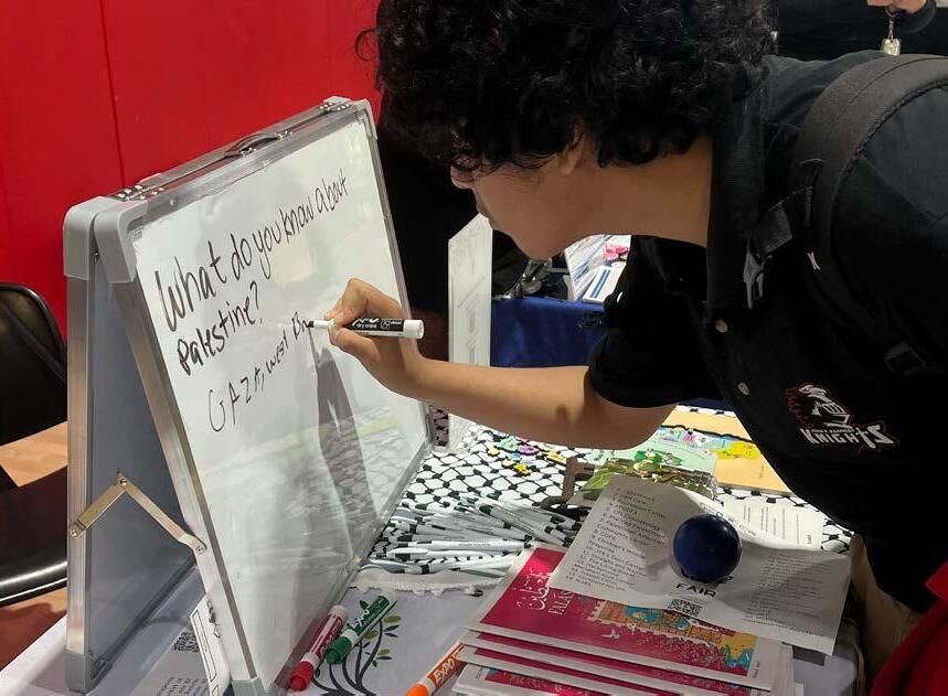We tabled at JFK High School’s Self- Care Fair where we educated students about Palestine and showcased Palestinian culture. We also explained the importance of civic engagement to them and making sure their voices are heard!