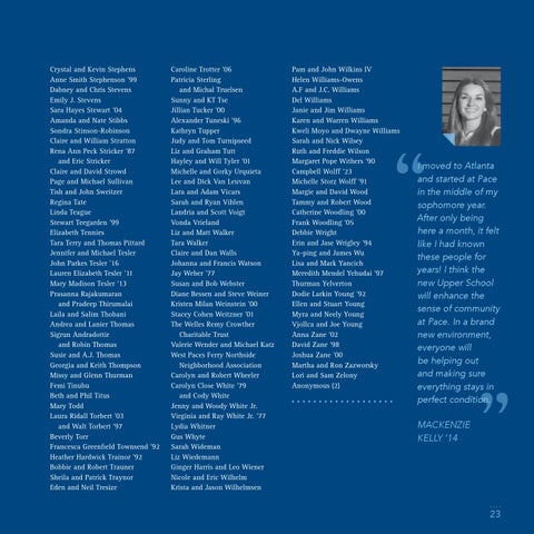 Pam and John Wilkins IV Helen Williams-Owens A.F and J.C. Williams Del Williams Janie and Jim Williams Karen and Warren Williams Kweli Moyo and Dwayne Williams Sarah and Nick Wilsey Ruth and Freddie Wilson Margaret Pope Withers ’90 Campbell Wolff ’23 Michelle Storz Wolff ’91 Margie and David Wood Tammy and Robert Wood Catherine Woodling ’00 Frank Woodling ’05 Debbie Wright Erin and Jase Wrigley ’94 Ya-ping and James Wu Lisa and Mark Yancich Meredith Mendel Yehudai ’97 Thurman Yelverton Dodie Larkin Young ’92 Ellen and Stuart Young Myra and Neely Young Vjollca and Joe Young Anna Zane ’02 David Zane ’98 Joshua Zane ’00 Martha and Ron Zazworsky Lori and Sam Zelony Anonymous (2)