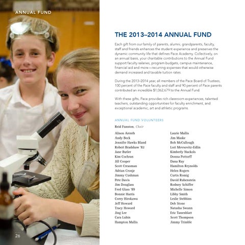 THE 2013–2014 ANNUAL FUND Each gift from our family of parents, alumni, grandparents, faculty, staff and friends enhances the student experience and preserves the dynamic community life that defines Pace Academy. Collectively, on an annual basis, your charitable contributions to the Annual Fund support faculty salaries, program budgets, campus maintenance, financial aid and more—recurring expenses that would otherwise demand increased and taxable tuition rates. During the 2013–2014 year, all members of the Pace Board of Trustees, 100 percent of the Pace faculty and staff and 90 percent of Pace parents contributed an incredible $1,062,679 to the Annual Fund. With these gifts, Pace provides rich classroom experiences, talented teachers, outstanding opportunities for faculty enrichment, and exceptional academic, art and athletic programs. A NNU A L F U ND V OL U NT EERS