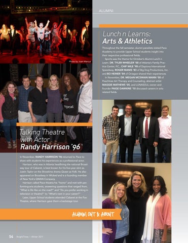 Talking Theatre with Actor Randy Harrison ’96 In November, RANDY HARRISON ’96 returned to Pace to share with students his experiences as a professional actor. Harrison, who was in Atlanta headlining the national Broadway tour of Cabaret, is best known for his five-year stint as Justin Taylor on the Showtime drama Queer as Folk. He also appeared on Broadway in Wicked and is a founding member of New York’s QWAN Company. Harrison called Pace theatre his “home” and met with performing-arts students, answering questions that ranged from, “What is life like on the road?” and “Do you prefer working in television or theatre?” to “What’s next in your career?” Later, Upper School students attended Cabaret at the Fox Theatre, where Harrison gave them a backstage tour.