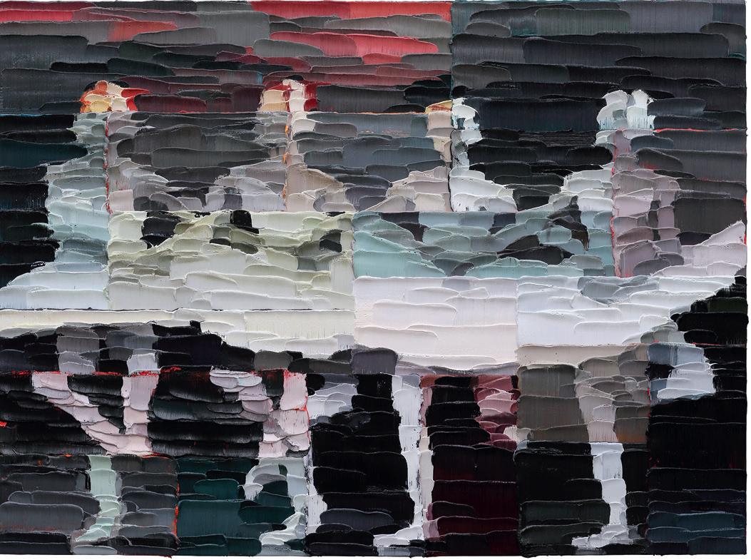 A painting from the year Li first went “abstract” illuminates a few salient aspects of this trajectory. The Last Goodbye (2022; fig. 1) features a rather legible scene of a ballet: the famously synchronized choreography of “Dance of the Little Swans” from Swan Lake. The way the image fractures into varying depths, tones, textures, hence emotional tenor epitomizes Li’s distinct compositional logic. Here, it also reads like a glitch effect that bleeds—