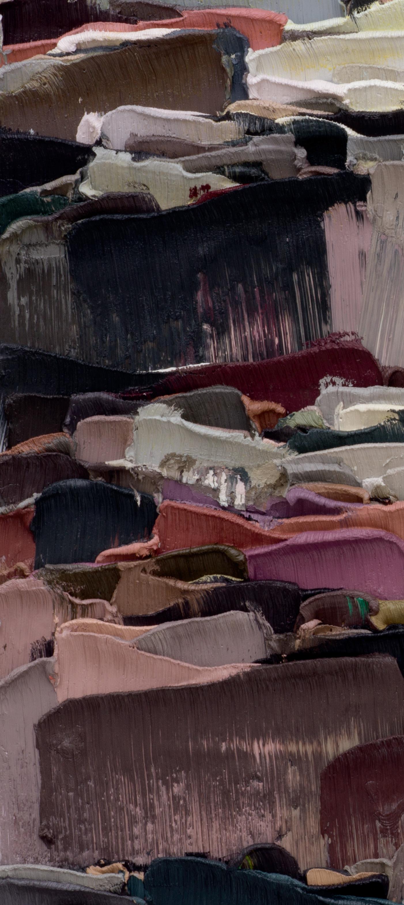 In Li Songsong’s new series of paintings, titled History (2023–), legible visual references— historical or personal—have completely vanished. Treating each impasto mark as a unique character, he builds layers that stack, squeeze, and warp at their brims ever-tantalizingly away from the canvas. The pull of wide brushes creates lacerations across layers, exposing a porous mixture of color and texture. Where these formidable applications of paint used to mount to some recognizable imagery, a void emerges. This is paradoxical, unsettling even, as the series’s title—and the artist’s practice over the past 20 years— implies that a certain narrative haunts these otherwise abstract compositions. To be sure, Li is by no means pivoting to pure formalism, stating that he “simply let