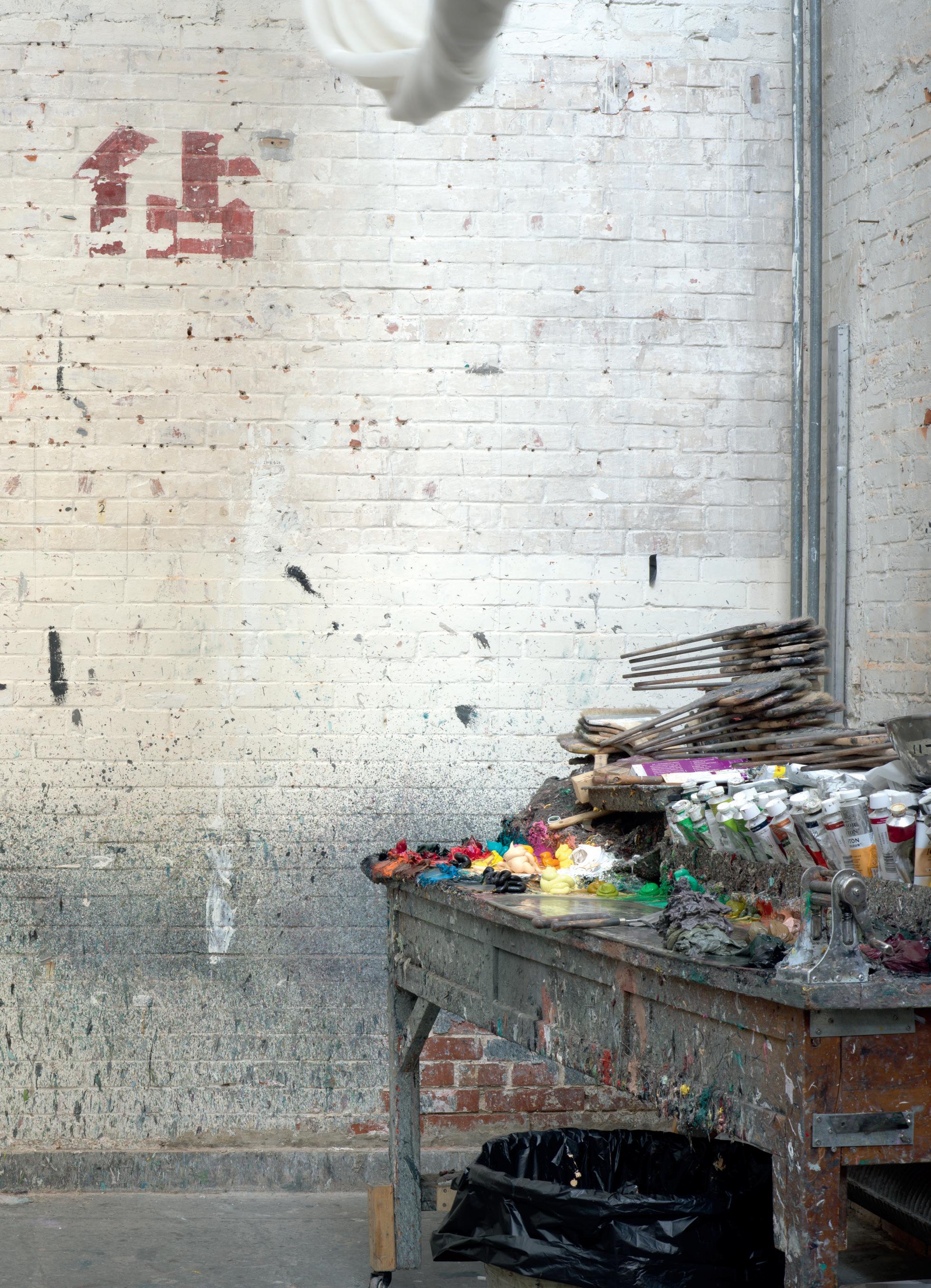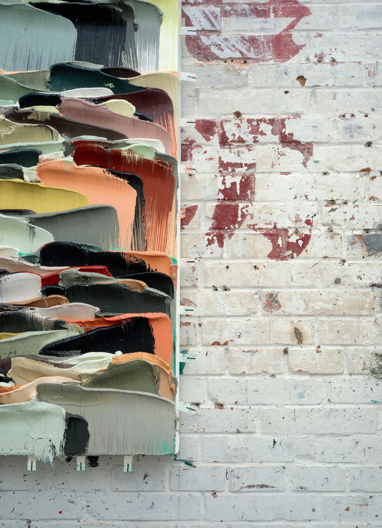 it not as evidence, but as symptom and pathos. It is not so jarring, then, that in his recent series explicitly titled The Past and History representational content has given way to the visceral and relational. Working from top to bottom with colors mixed fresh out of tube, Li does not touch or rework the layers that have already been laid on canvas, though accidents are often preserved. He sees agency in his brush strokes: “Every brush is complete, with its own character and fate; it’s as if each has a mission and responsibility.”⁵ The segments are still there, hidden from view but guiding the composition from underneath, much like the ideologically-charged features (faded Mao slogans on brick walls) in the Bauhaus-style studio where he has operated over the past 24 years