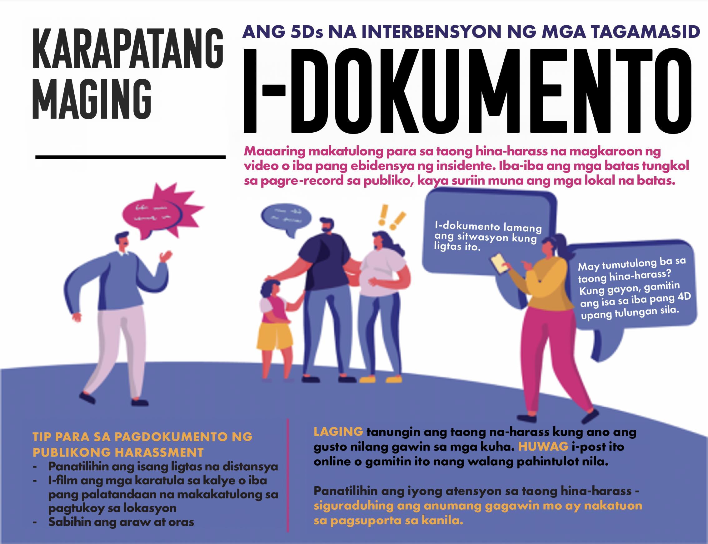 • Tasahin ang sitwasyon. Kung walang tumutulong sa taong hina-harass, gumamit ng isa pa sa mga 5 D’s. Ang pagtatala ng karanasan ng isang tao sa pinsala nang hindi tinitiyak na nakakatanggap sila ng tulong ay maaaring lumikha ng karagdagang trauma para sa kanila. Kung may tumulong na: tasahin ang sarili mong kaligtasan, at kung ligtas ka, simulan ang pagdodokumento.