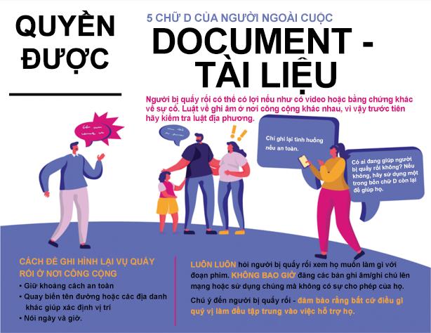 5 chữ D. Ghi lại trải nghiệm bị làm hại của ai đó trong trường hợp chưa ai giúp đỡ họ sẽ tạo thêm chấn thương cho họ. Nếu người khác đã giúp đỡ: đánh giá sự an toàn của chính quý vị và nếu quý vị an toàn, hãy bắt