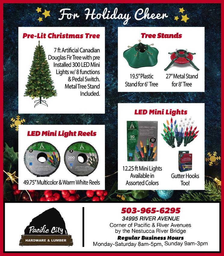 Please visit our website for information regarding updates regarding Covid-19, along with information about the livestream of our weekly worship services. nestuccavalleypc.org Nestucca Valley Presbyterian Church Friday: Bible Study Class, 10:00-11:00 AM Sunday: Worship Service, 10:00-11:00 AM Ad Reservation Deadline is Dec. 12. The next issue of the Pacific City Sun hits stands on Dec. 16. Call 503-801-5221 to reserve space for your business. in Pacific City The Forecast is for: SUN