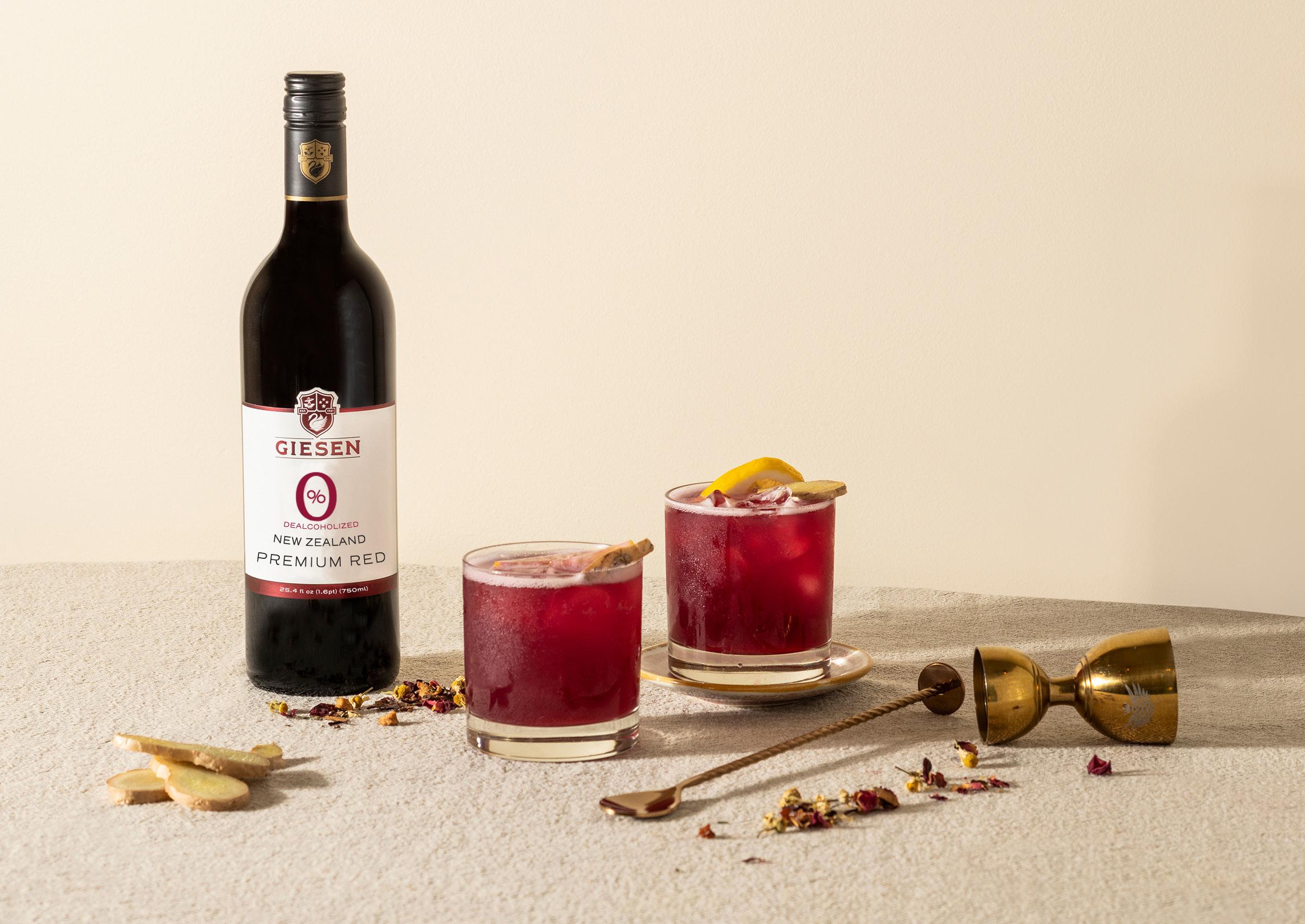 1. Pour Giesen 0% Premium Red, lemon juice & honey into a cocktail shaker with ice.