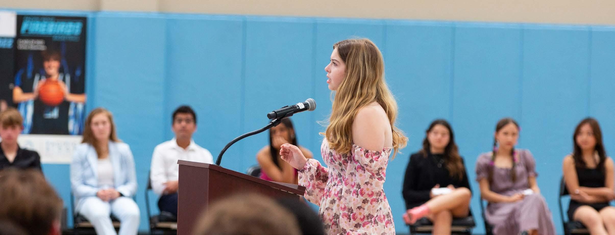 Orations are an opportunity for ninth grade students to have their voice heard by the entire community. Over the course of the year students research, write, revise, and perfect an original speech on a topic that matters to them. It is a time when ninth grade students explore what interests them, the identities they carry, and ultimately discover the voice that will support them in their high school journey.
