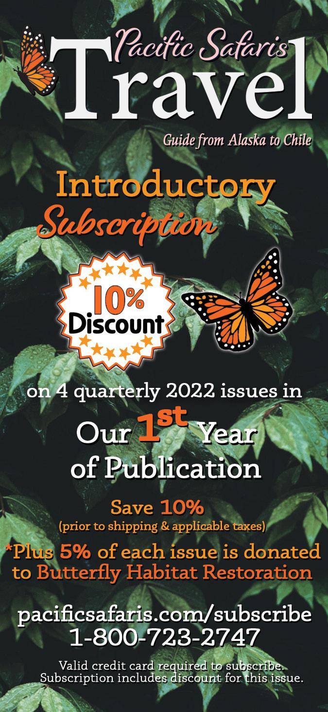 One in point is the incredible 5,000 km migration of the Monarch Butterfly every season to a specific mountainous biosphere of only 140, 000 acres in southern Mexico. This delicate flutterer is the farthest traveling insect and proudly represents our magazine. These butterflies are also primary pollinators and tragically, like bees, the Monarch population is rapidly declining due to insecticide use along their migration route. Pacific Safaris Travel encourages responsible change and donates 5% of all subscription fees, both on-line and print publications, to butterfly habitat restoration.