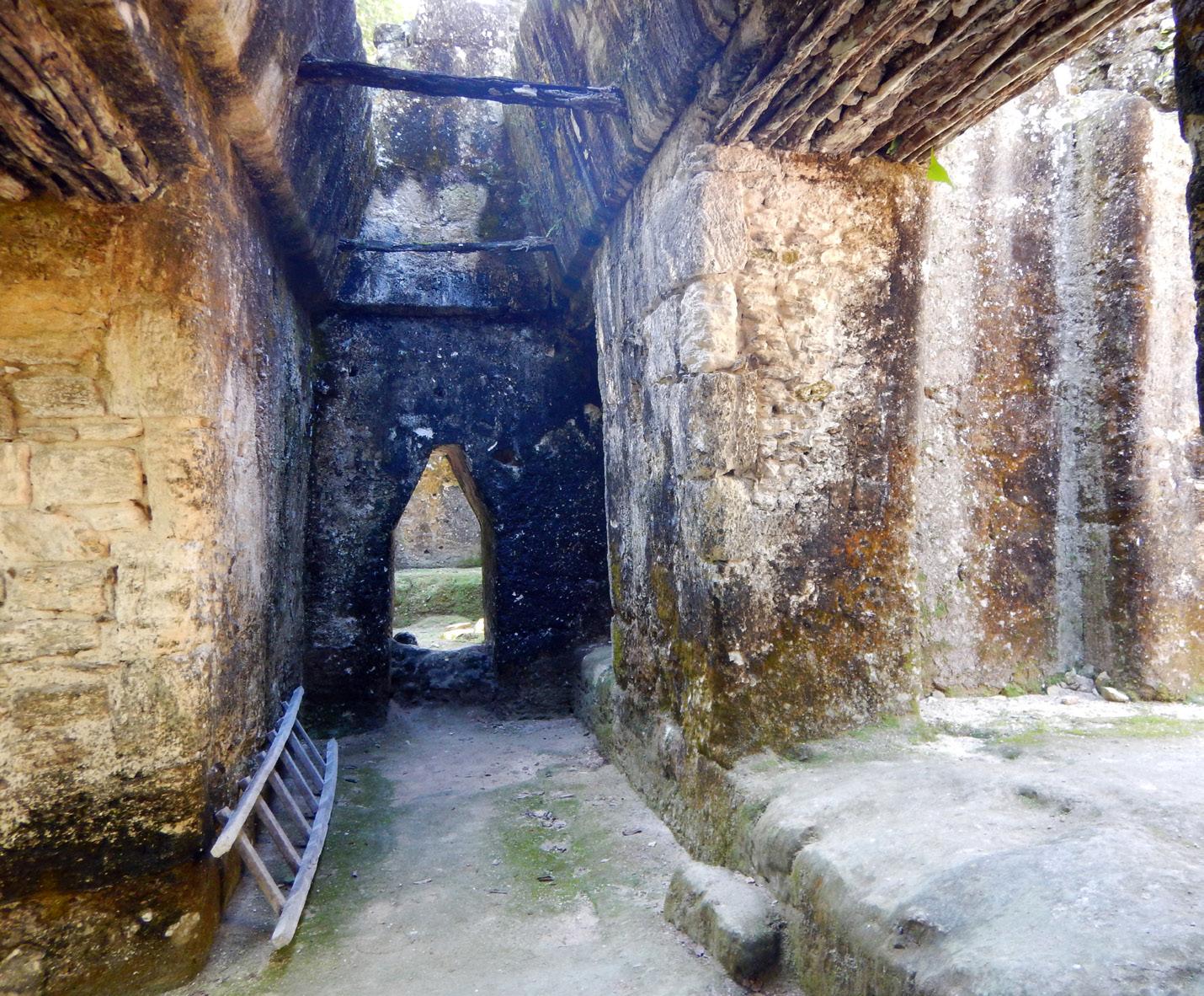 A faint sunset guided our walk to the entrance of the ruins and within minutes we were in the Gran Plaza at the base of Templo I, Temple of the Jaquar Priest, circa 810 AD (see page 6).
