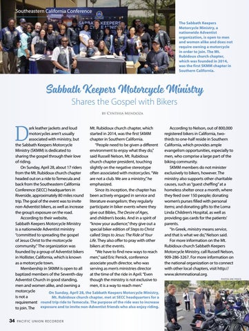 Mt. Rubidoux church chapter, which ark leather jackets and loud started in 2014, was the first SKMM motorcycles aren’t usually chapter in Southern California. associated with ministry, but “People need to be given a different the Sabbath Keepers Motorcycle environment to enjoy what they do,” Ministry (SKMM) is dedicated to said Russell Nelson, Mt. Rubidoux sharing the gospel through their love church chapter president, touching of riding. slightly on the negative stereotype On Sunday, April 28, about 17 riders often associated with motorcycles. “We from the Mt. Rubidoux church chapter are not a club. We are a ministry,” he headed out on a ride to Temecula and emphasized. back from the Southeastern California Since its inception, the chapter has Conference (SECC) headquarters in Riverside, approximately 80 miles round been actively engaged in service and literature evangelism; they regularly trip. The goal of the event was to invite non-Adventist bikers, as well as increase participate in biker events where they give out Bibles, The Desire of Ages, the group’s exposure on the road. and children’s books. And in a spirit of According to their website, “know your audience,” they give out a Sabbath Keepers Motorcycle Ministry special biker edition of Steps to Christ is a nationwide Adventist ministry called Steps to Jesus: The Ride of Your “committed to spreading the gospel Life. They also offer to pray with other of Jesus Christ to the motorcycle bikers at the events. community.” The organization was founded by a group of Adventist bikers “We have to find new ways to reach men,” said Eric Penick, conference in Hollister, California, which is known associate youth director, who was as a motorcycle town. serving as men’s ministries director Membership in SKMM is open to all at the time of the ride in April. “Even baptized members of the Seventh-day Adventist Church in good standing, though the ministry is not exclusive to men, it is a way to reach men.” men and women alike, and owning a motorcycle On Sunday, April 28, the Sabbath Keepers Motorcycle Ministry, is not a Mt. Rubidoux church chapter, met at SECC headquarters for a requirement round trip ride to Temecula. The purpose of the ride was to increase to join. The exposure and to invite non-Adventist friends who also enjoy riding.