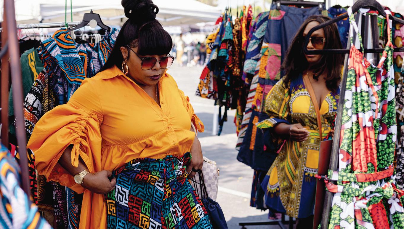 Los asistentes compran en un puesto que vende ropa africana. DERECHA: Un vendedor de comida sonríe mientras sirve otro pedido.