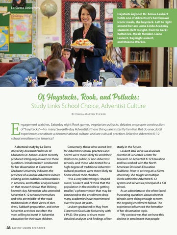 study in the future. Leukert also serves as associate director of La Sierra’s Center for Research on Adventist K-12 Education and has worked with the North American Division’s Education Taskforce. Prior to arriving at La Sierra University, she taught at multiple levels within the Adventist K-12 system and served as principal of a K-8 school. As an administrator she often faced frustrating questions about whether schools were doing enough to stem the ongoing enrollment fallout. The experience influenced the formation of her dissertation topic. “My context was that we have this decline in enrollment that people