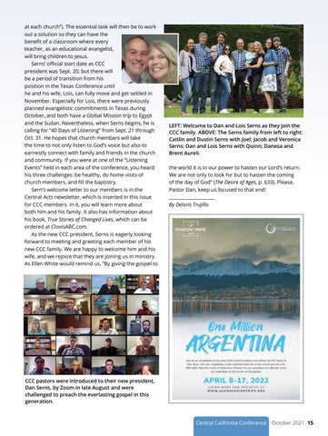 at each church”). The essential task will then be to work out a solution so they can have the benefit of a classroom where every teacher, as an educational evangelist, will bring children to Jesus. Serns’ official start date as CCC president was Sept. 20, but there will be a period of transition from his position in the Texas Conference until he and his wife, Lois, can fully move and get settled in November. Especially for Lois, there were previously planned evangelistic commitments in Texas during October, and both have a Global Mission trip to Egypt and the Sudan. Nevertheless, when Serns begins, he is calling for “40 Days of Listening” from Sept. 21 through Oct. 31. He hopes that church members will take the time to not only listen to God’s voice but also to earnestly connect with family and friends in the church and community. If you were at one of the “Listening Events” held in each area of the conference, you heard his three challenges: be healthy, do home visits of church members, and fill the baptistry. Sern’s welcome letter to our members is in the Central Acts newsletter, which is inserted in this issue for CCC members. In it, you will learn more about both him and his family. It also has information about his book, True Stories of Changed Lives, which can be ordered at ClovisABC.com. As the new CCC president, Serns is eagerly looking forward to meeting and greeting each member of his new CCC family. We are happy to welcome him and his wife, and we rejoice that they are joining us in ministry. As Ellen White would remind us, “By giving the gospel to