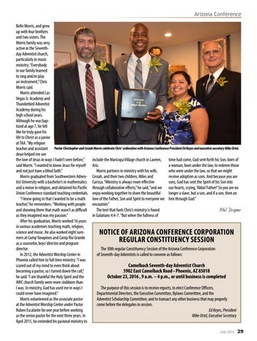 Arizona Conference Belle Morris, and grew up with four brothers and two sisters. The Morris family was very active in the Seventhday Adventist church, particularly in music ministry. “Everybody in our family learned to sing and/or play an instrument,” Chris Morris said. Morris attended Las Vegas Jr. Academy and Thunderbird Adventist Academy during his high school years. Although he was baptized at age 7, he felt like he truly gave his life to Christ as a junior at TAA. “My religion teacher and assistant Pastor Christopher and Cesiah Morris celebrate Chris’ ordination with Arizona Conference President Ed Keyes and executive secretary Mike Ortel. dean helped me see the love of Jesus in ways I hadn’t seen before,” include the Maricopa Village church in Laveen, time had come, God sent forth his Son, born of said Morris. “I wanted to know Jesus for myself Ariz. a woman, born under the law, to redeem those and not just have a blind faith.” Morris partners in ministry with his wife, who were under the law, so that we might Morris graduated from Southwestern Adven- Cesiah, and their two children, Miles and receive adoption as sons. And because you are tist University with a bachelor’s in mathematics Carissa. “Ministry is always more effective sons, God has sent the Spirit of his Son into and a minor in religion, and obtained his Pacific through collaborative efforts,” he said, “and we our hearts, crying, ‘Abba! Father!’ So you are no Union Conference standard teaching credentials. enjoy working together to share the beautiful longer a slave, but a son, and if a son, then an “I knew going in that I wanted to be a math love of the Father, Son and Spirit to everyone we heir through God.” teacher,” he remembers. “Working with people encounter.” and showing them that math wasn’t as difficult The text that fuels Chris’s ministry is found Phil Draper as they imagined was my passion.” in Galatians 4:4-7. “But when the fullness of After his graduation, Morris worked 16 years in various academies teaching math, religion, science and music. He also worked eight summers at Camp Yavapines and Camp Rio Grande as a counselor, boys’ director and program director. The 30th regular Constituency Session of the Arizona Conference Corporation In 2012, the Adventist Worship Center in of Seventh-day Adventists is called to convene as follows: Phoenix called him to full time ministry. “I was scared out of my mind to even think about Camelback Seventh-day Adventist Church becoming a pastor, so I turned down the call,” 5902 East Camelback Road • Phoenix, AZ 85018 he said. “I am thankful the Holy Spirit and the October 23, 2016 , 9 a.m. – 4 p.m., or until business is completed AWC church family were more stubborn than I was. In ministry, God has used me in ways I The purpose of this session is to receive reports, to elect Conference Officers, could never have imagined.” Departmental Directors, the Executive Committee, Bylaws Committee, and the Morris volunteered as the associate pastor Adventist Scholarship Committee; and to transact any other business that may properly at the Adventist Worship Center under Pastor come before the delegates in session. Ruben Escalante for one year before working Ed Keyes, President as the senior pastor for the next three years. In Mike Ortel, Executive Secretary April 2015, he extended his pastoral ministry to