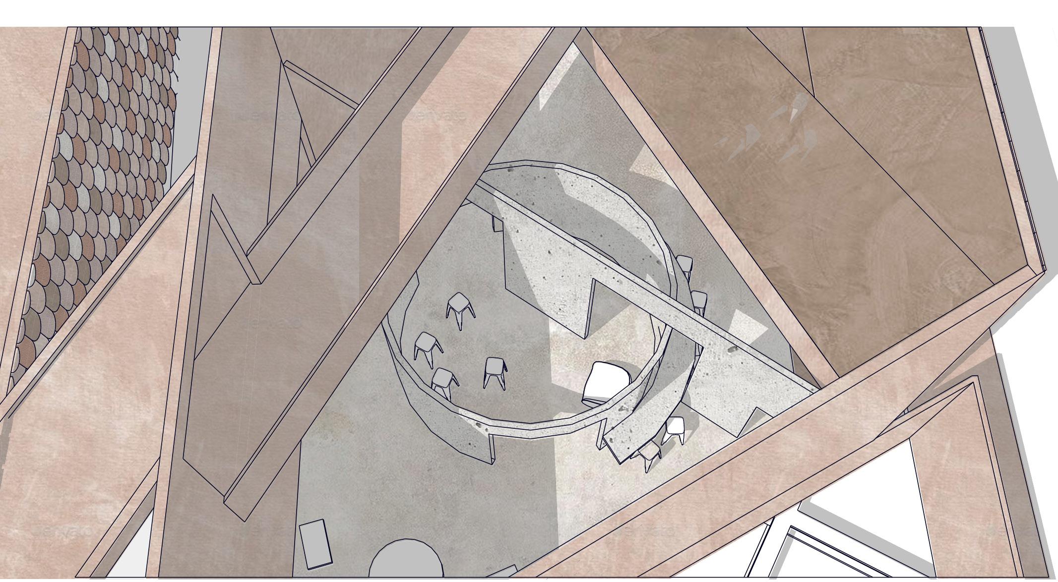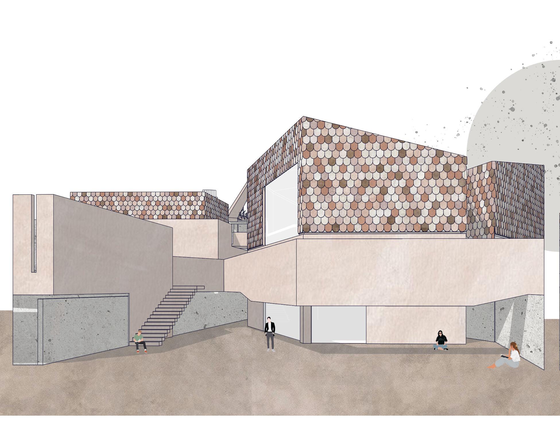 - A new axis that breaks the current ‘straight’ layout of Capitol Hill, which turns towards the Seattle CBD, taking advantage of the horizontality of the neighborhood to frame the views toward the skyscrapers. This symbolizes the repression of the heteronormative world, where despite the denial of our own identities, instincts handle us at will and we seem like puppets of our own desires, leading us to a different path than the ‘straight’ one. Also, its changing form symbolizes the changing nature, that just like this, people change and evolve their identities. A facade of scale skin that represents all the skin tones of all humans, and thus, a space where everyone is welcome and at the same time represented.