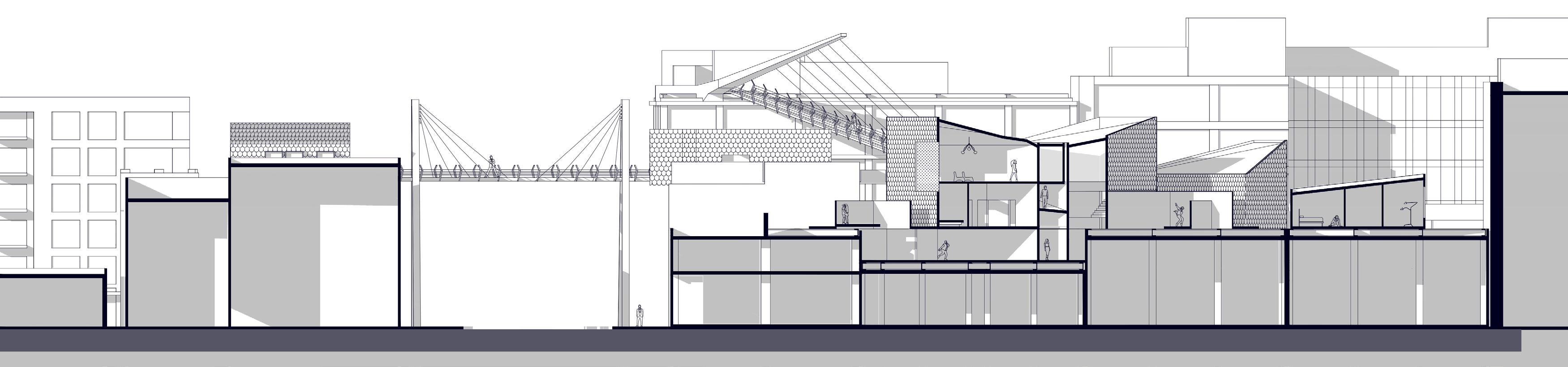 The existing structure is taken into account as main axes, where beams that coincide with the walls and columns of the current buildings are adhered. A new axis that turns at an angle of 30° that turns towards the CBD, will serve to create the new ‘queer’ paths, these alleys that will move people from a new queer angle in this new layer, through the new spaces .