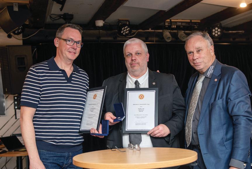 Der blev naturligvis også tid til de traditionsrige nålestik: Ken Veidiksen (tv.) modtog en 25 års- og Bo Krogså en 40 års nål for medlemskab af Københavns Automekaniker Laug.