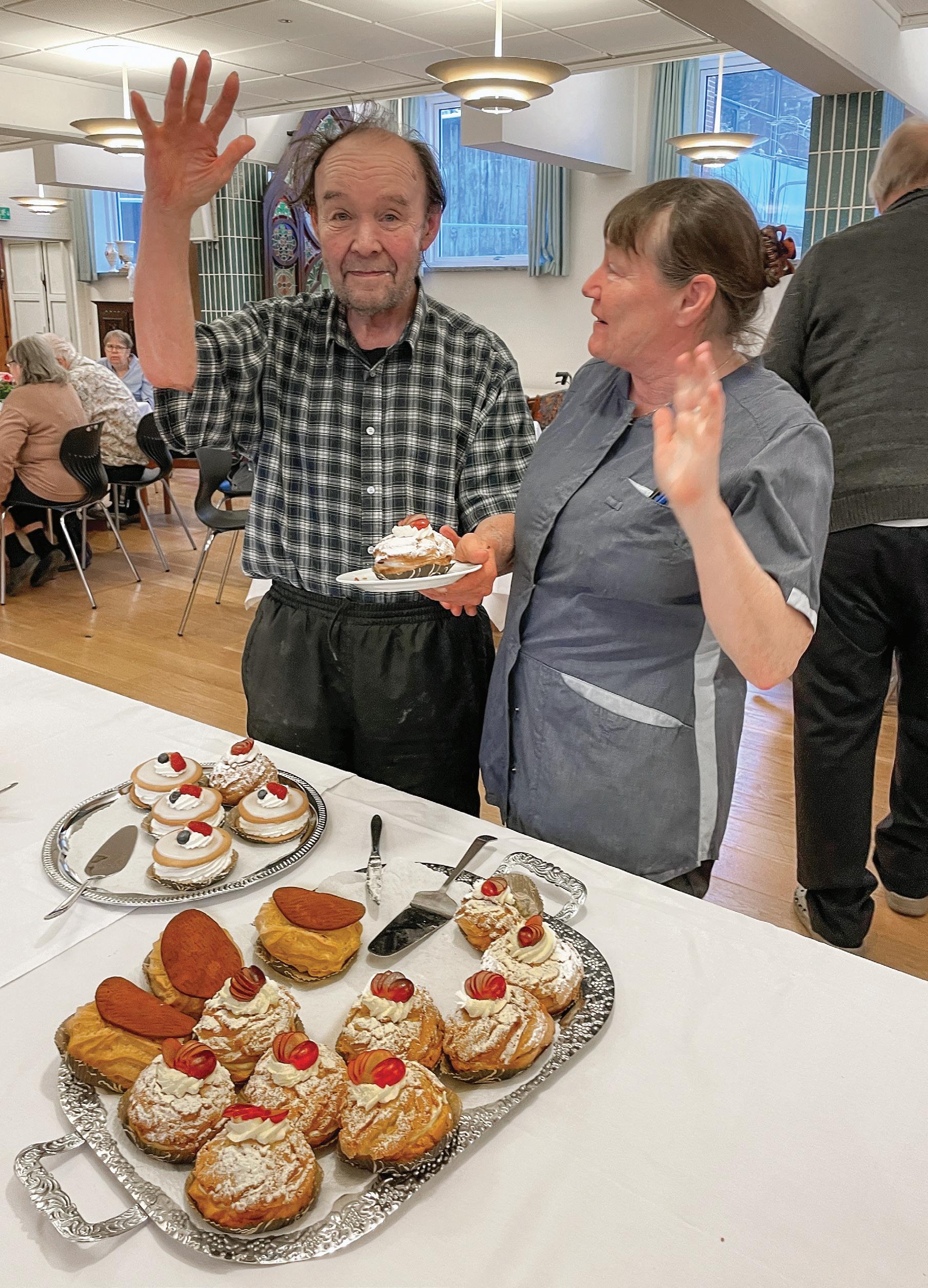 FORSIDEN: Eriks Konditori var på ny leverandør, da Plejehjemmets Festsal nok engang dannede rammen om alletiders kagefest. På billedet vinker Jørgen Chemnitz, Afd. 2 A, til fotografen sammen med Mette Frendup, Aktiviteten. Foto: Bente Bülow