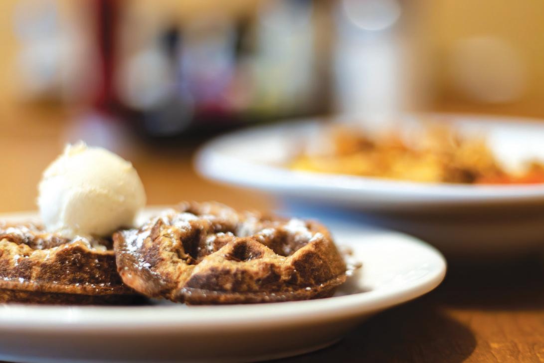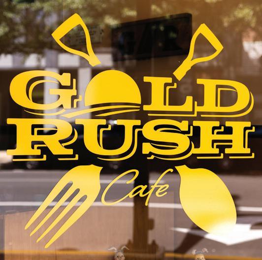 AS THE RIVER SHIMMERS IN THE GOLDEN glow of sunrise, the glass doors of the Gold Rush Cafe unlock, swing open, and invite visitors in for a unique breakfast experience. One step into the rustic western cafe on the corner of 4th and Broadway and you’re greeted with a smile as the aroma of freshly made bread pudding waffles wafts through the corridor. The space is quaint and abuzz as a motley collection of signs along the lattice-laced walls gives you a laugh. Inside the lively cafe, you might catch owner Korey Vazquez, the man who revived this little corner cafe and who also finds creative fulfillment not only in the kitchen but also on the stage.