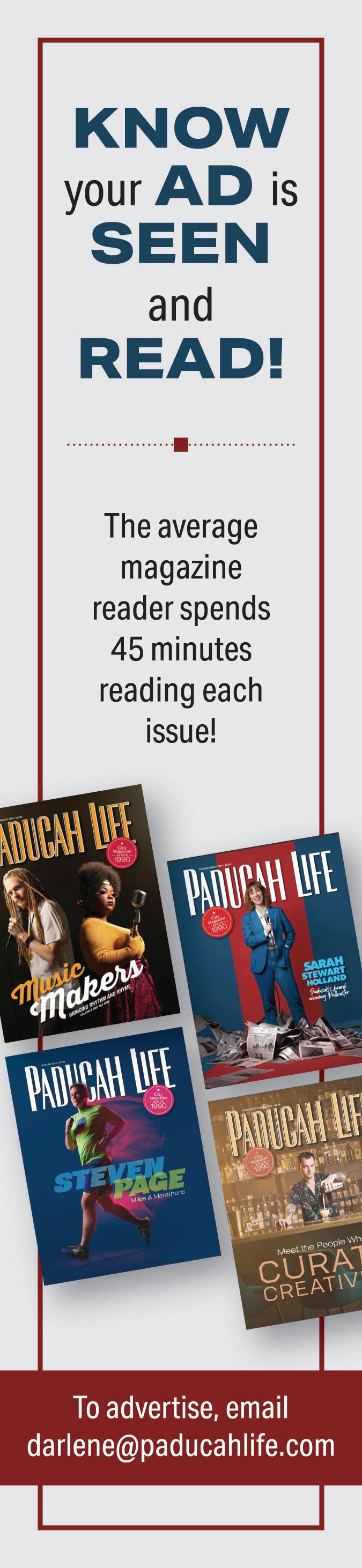 Paducah Life is published six times a year for the Paducah area. All contents copyright 2024 by Mazzone Communications. Reproduction or use of the contents without written permission is prohibited. Comments written in this magazine are those of the authors and do not necessarily reflect the opinion of the ownership or management of Paducah Life. Subscription rate is $29.95 for six issues. Subscription inquiries, all remittances and all advertising inquiries should be sent to Paducah Life, 2780 D New Holt Rd. #346, Paducah, KY 42001.