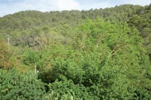 This is a photograph of the Corbières forest looking north towards the National forest at Thézan and the Communal forest of Ferrals. These distinctions refer to the bodies responsible for care of the different forests. Prior to deforestation the forest consisted mostly of holm oak, while the regenerating forest is made up of pines.