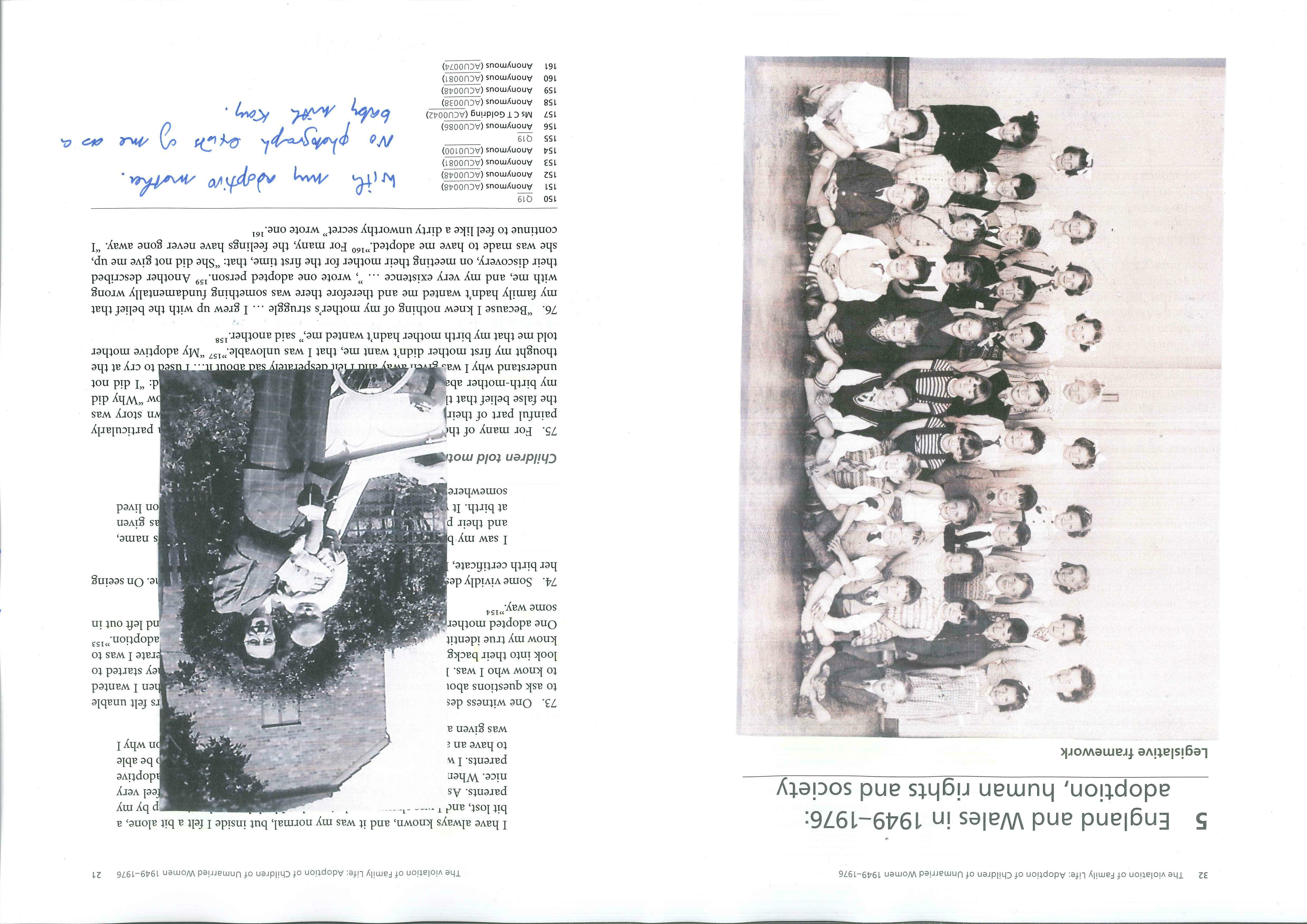 This work is the first in a series of pieces inspired by the Parliamentary JCH Rreport of July 2022 'The Violation of Family Life: Adoption of Children of Unmarried Women 1949 - 1976. I superimpose family photographs plus marginalia across the report's text to confront a system that treated my mother so appallingly when she was young and vulnerable. Most of the photographs are of me growing up, knowing little of the difficulties my mother had faced, of the way 'officialdom' had treated her (and me), yet all the time somehow sensing in the background the 'shadow' of a different life in a different family. My mother and I were reunited when I was 25.