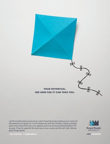 Let put your work andand Let the the transformative transformative power powerof ofour ourcohort-based cohort-basedlearning learningmodel model put your work life experience to great use. You’ll collaborate with like-minded, industry-leading life experience to great use. You’ll collaborate with like-minded, industry-leading peers platform forfor peers every everystep stepof ofthe theway wayininan anapplied, applied,practical practicaland andpersonalized personalized platform success. you’re ready ready for success. If If you’re for the the next next step stepin inyour yourcareer, career,and andlife, life,let’s let’stalk. talk.We Wesee see great things ahead. great things ahead. 1.877.778.6227 royalroads.ca 1.877.778.6227 || royalroads.ca