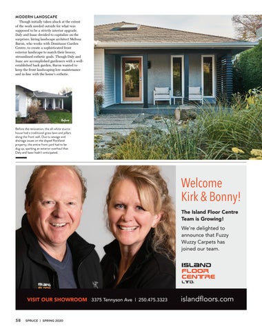 MODERN LANDSCAPE Though initially taken aback at the extent of the work needed outside for what was supposed to be a strictly interior upgrade, Daly and Isaac decided to capitalize on the surprises, hiring landscape architect Melissa Baron, who works with Demitasse Garden Centre, to create a sophisticated front exterior landscape to match their breezy, streamlined esthetic goals. Though Daly and Isaac are accomplished gardeners with a wellestablished back garden, Baron wanted to keep the front landscaping low maintenance and in-line with the home’s esthetic.