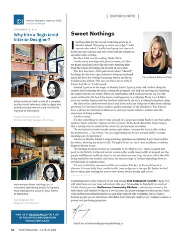 had big plans for my recent week-long getaway to Hornby Island. “I’m going to write every day,” I told anyone who asked. I stuffed my laptop and research books into my suitcase and off I went with my scheme to spend my days writing. But then I did exactly nothing. Nada. Zilch. I woke every morning with plans to write, and then my plans just faded away like the early morning mist from the beach stretching out in front of our cabin. The first day there, I felt guilt about what I “should” be doing. By day two, I got defensive when my husband Kerry Slavens, Editor-in-Chief asked me how the writing was going. But by day three, I had become defiant. “No one can force me to write if I don’t feel like it,” I told myself. Instead, I gave in to the magic of Hornby Island. I got up early and strolled along the country lane bordering the farm, visiting the pregnant cow and her yearling and watching the eagles ride the sea winds. When the mist burned off, I would cross the log over the creek and head to the beach for hours, reading poetry or exploring. Many days, I didn’t even see another human until my husband returned in the early evening from guitar camp. My days in the cabin between beach and farm ended up being one of the most relaxing getaways I’ve had since those endless, golden summers of my childhood. The Italians have a phrase for this kind of idleness: la dolce far niente, which translates into the sweetness of doing nothing. And it is sweet. It’s also something we don’t value enough in a go-go-go society hooked on what author Andrew Smart calls the “culture of effectiveness.” In his book Autopilot, Smart argues that a resting state is essential for creativity and memory retention. “In our hysterical rush to make money, gain status, compete for scarce jobs, jockey for promotions ... ,” he writes, “we are suppressing our brain’s natural ability to make meaning out of experience.” And so on Hornby Island, I stopped doing, planning and striving. I gave into la dolce far niente, allowing my brain to idle. Though I didn’t act on it then and there, creativity began to bloom in me. “Everything in nature invites us constantly to be what we are,” wrote essayist and poet Greta Ehrlich. I reflected on her words as the world came to life all around me: the purple wildflowers suddenly there in the meadow one morning, the new calf in the field being tended by her mother and sister, the meanderings of dozens of goslings born to several pairs of Canada Geese. It’s easy to find the sweetness of life on vacation. The key, as I’m realizing, is to discover it in our daily lives, amidst traffic jams and grocery lineups. It’s harder to find, but it’s there, just waiting for you to slow down, breath deeply and notice. ______________ Congratulations to the winners of our 2nd annual Best Restaurant Awards! I hope you will visit them on your taste adventures this year. I’d also like to highlight the work of YAM’s charity partner, Shelbourne Community Kitchen, a community resource for individuals and families living on a low income and experiencing food insecurity. Please visit shelbournecommunitykitchen.ca and help support this wonderful service that is helping people access nutritious, affordable food through small-group cooking sessions, a pantry and gardening programs.
