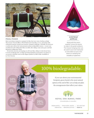 PEDAL POWER Have you always wanted to commute by bike, but were wary of urban cycling? The Greater Victoria Bike to Work Week runs from May 25 to 31, and along with celebration stations around town and the commuter challenge, a friendly race between a cyclist and a driver, the week promotes urban cycling skills courses — 70 per cent of adults feel safer riding their bikes in traffic after taking a class and 75 per cent find themselves riding more often. If sartorial concerns are keeping you off your bike, riding to work doesn’t have to mean sacrificing style. Cycling’s growing popularity means there are plenty of accessories with flair, such as this dapper pannier by Hill & Ellis. Available at Le Vé lo Victoria.