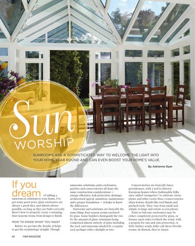 WO R S H I P SUNROOMS ARE A SOPHISTICATED WAY TO WELCOME THE LIGHT INTO YOUR HOME YEAR ROUND AND CAN EVEN BOOST YOUR HOME’S VALUE. By Adrienne Dyer